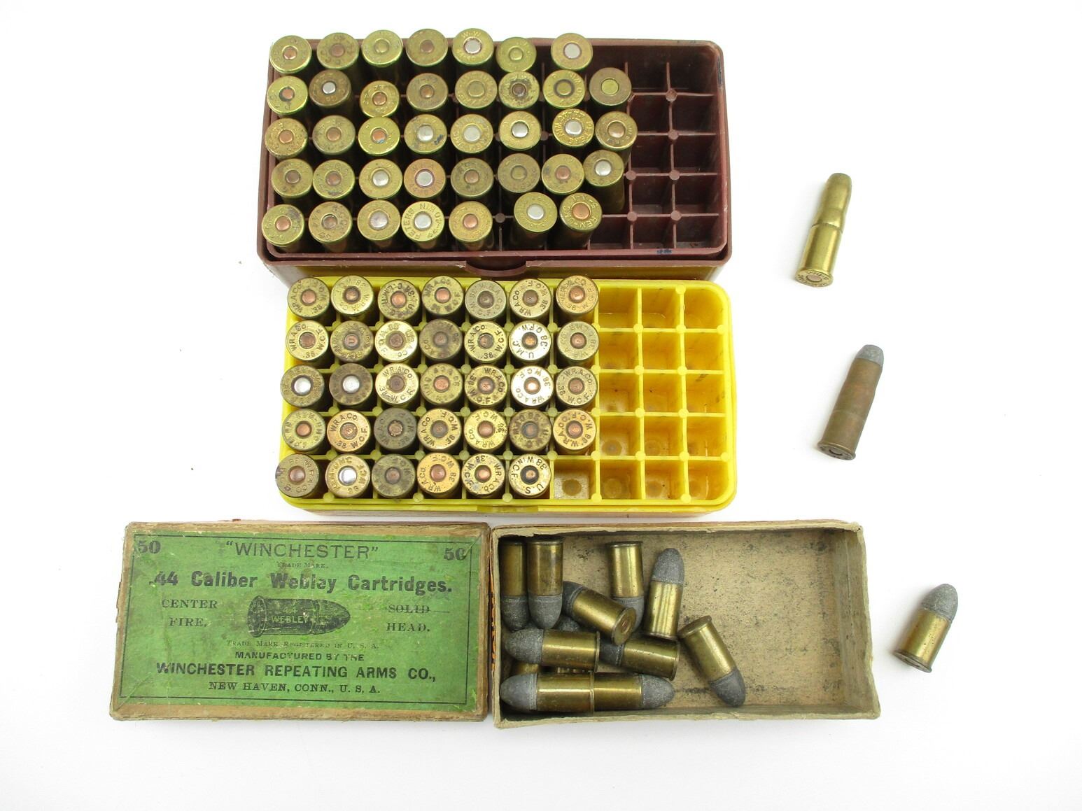 COLLECTIBLE ASSORTED PISTOL AMMO, 87 RNDS, LOT INCLUDES: .44 WEBLEY, .38 W.C.F., .44-40 WIN, ETC., LOT INCLUDES (1) COLLECTIBLE AMMO BOX, THERE ARE NEW SHIPPING RESTRICTIONS, PLEASE MAKE SURE YOU HAVE READ AND CONFIRMED WE CAN SHIP TO YOU BEFORE BIDDING ON THIS LOT. PLEASE SEE LOT 0 IN THIS SESSION. NO REFUNDS WILL BE ISSUED, OR BIDS RETRACTED