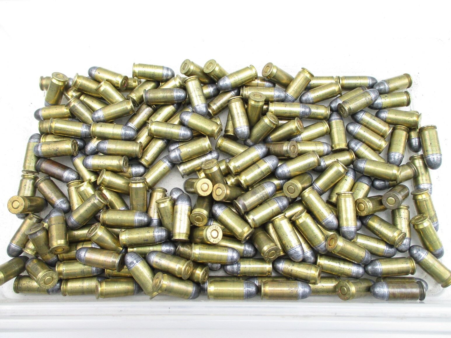 RELOADED .45 AUTO AMMO, APPROX 9.6 LBS, MAY INCLUDE OTHER CALIBERS, THERE ARE NEW SHIPPING RESTRICTIONS, PLEASE MAKE SURE YOU HAVE READ AND CONFIRMED WE CAN SHIP TO YOU BEFORE BIDDING ON THIS LOT. PLEASE SEE LOT 0 IN THIS SESSION. NO REFUNDS WILL BE ISSUED, OR BIDS RETRACTED, THIS IS NON FACTORY RELOADS. IT IS BEING SOLD AS COMPONENTS ONLY. USE OTHER THAN DESCRIBED IS COMPLETELY AT YOUR RISK.