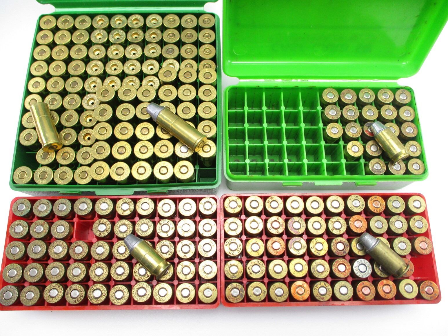 RELOADED .45 COLT AMMO, 156 RNDS, 32 PRIMED BRASS, 35 NON-PRIMED BRASS, LOT ALSO INCLUDES (4) PLASTIC AMMO CONTAINERS, VARIOUS TYPES. SEE PHOTOS, THERE ARE NEW SHIPPING RESTRICTIONS, PLEASE MAKE SURE YOU HAVE READ AND CONFIRMED WE CAN SHIP TO YOU BEFORE BIDDING ON THIS LOT. PLEASE SEE LOT 0 IN THIS SESSION. NO REFUNDS WILL BE ISSUED, OR BIDS RETRACTED, THIS IS NON FACTORY RELOADS. IT IS BEING SOLD AS COMPONENTS ONLY. USE OTHER THAN DESCRIBED IS COMPLETELY AT YOUR RISK.