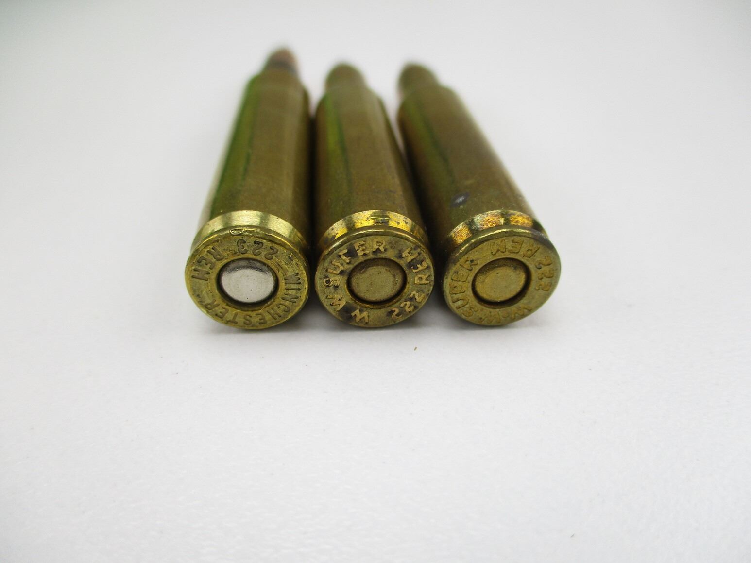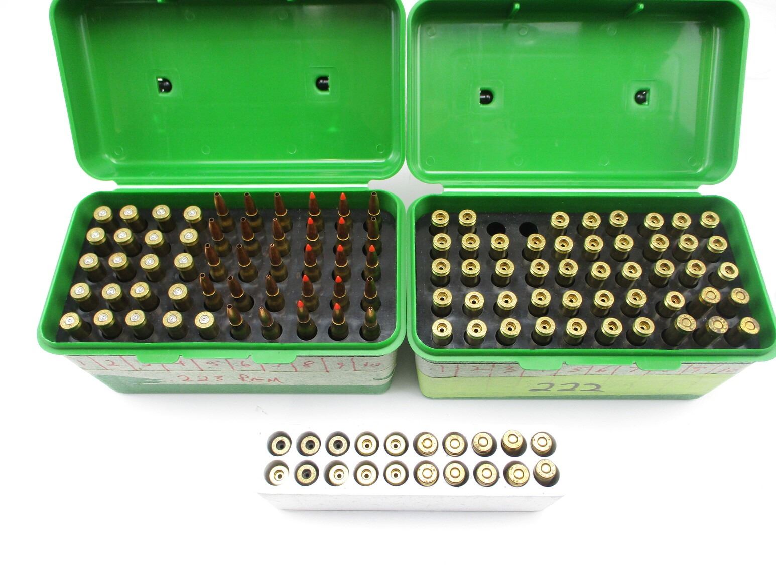 RELOADED ASSORTED .222 REM AND .223 REM AMMO, 44 RNDS, 74 NON-PRIMED BRASS, LOT ALSO INCLUDES (2) 50 ROUND AMMO CONTAINERS, THERE ARE NEW SHIPPING RESTRICTIONS, PLEASE MAKE SURE YOU HAVE READ AND CONFIRMED WE CAN SHIP TO YOU BEFORE BIDDING ON THIS LOT. PLEASE SEE LOT 0 IN THIS SESSION. NO REFUNDS WILL BE ISSUED, OR BIDS RETRACTED, THIS IS NON FACTORY RELOADS. IT IS BEING SOLD AS COMPONENTS ONLY. USE OTHER THAN DESCRIBED IS COMPLETELY AT YOUR RISK.