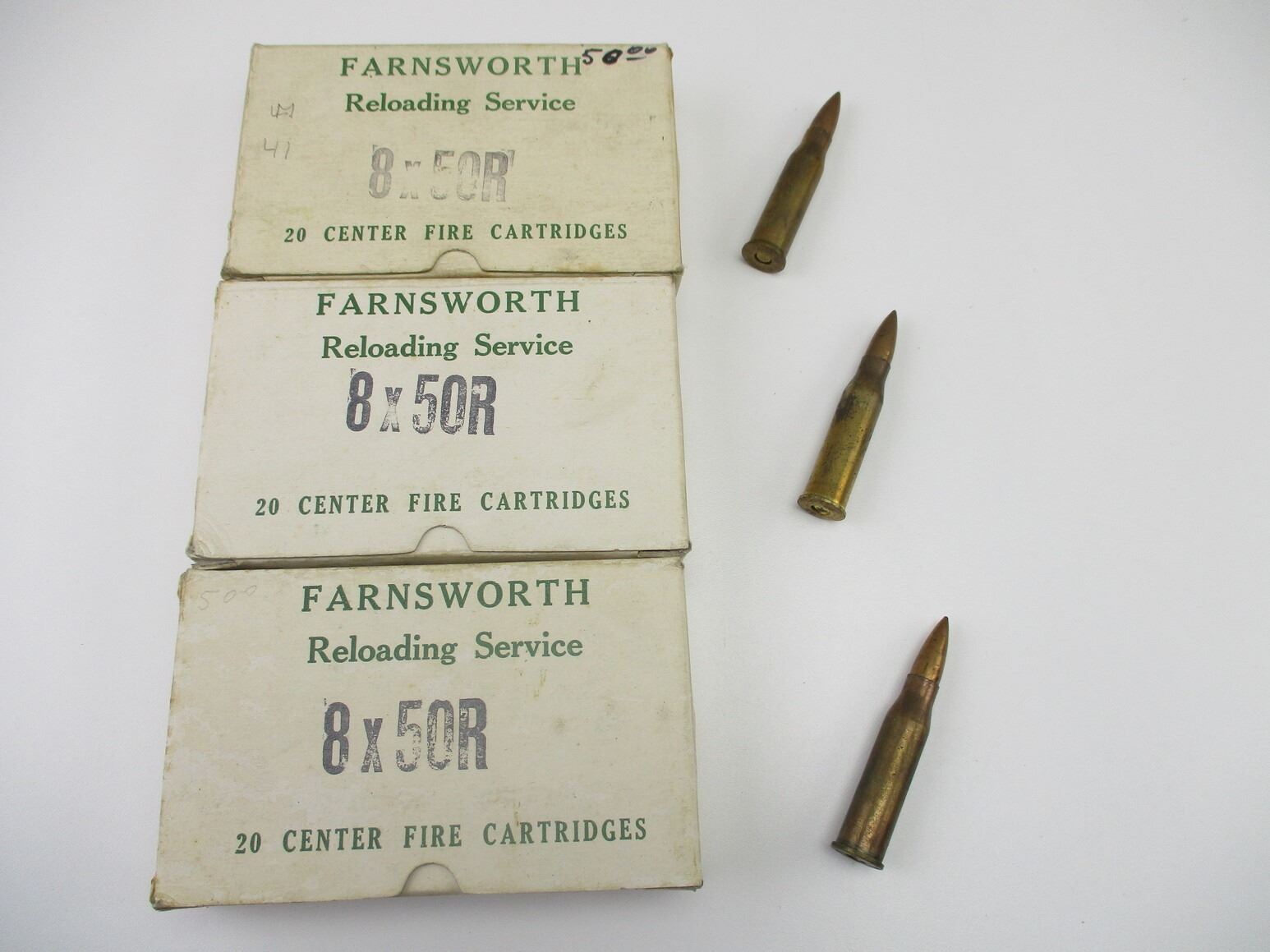 RELOADED 8X50R STEYR AMMO, 60 RNDS, FACTORY RELOADED BY FARNSWORTH RELOADING SERVICE , THERE ARE NEW SHIPPING RESTRICTIONS, PLEASE MAKE SURE YOU HAVE READ AND CONFIRMED WE CAN SHIP TO YOU BEFORE BIDDING ON THIS LOT. PLEASE SEE LOT 0 IN THIS SESSION. NO REFUNDS WILL BE ISSUED, OR BIDS RETRACTED, THIS IS NON FACTORY RELOADS. IT IS BEING SOLD AS COMPONENTS ONLY. USE OTHER THAN DESCRIBED IS COMPLETELY AT YOUR RISK.