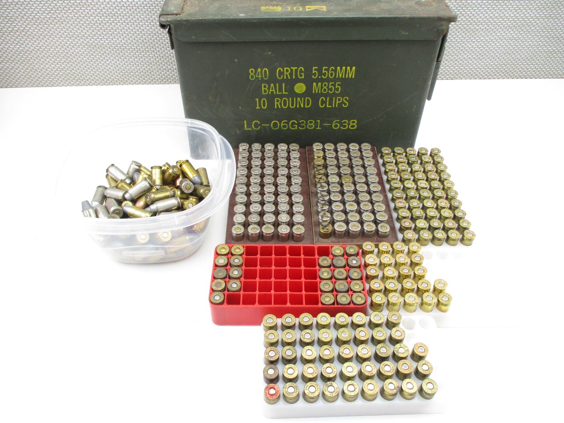 RELOADED .45 AUTO AMMO, 388 RNDS, VARIOUS BULLET TYPES, LOT MAY INCLUDE FACTORY AMMO RNDS, MAY INCLUDE OTHER CALIBERS, LOT ALSO INCLUDES (1) AMMO TIN, APPROX 12" X 6" X 7.5", THERE ARE NEW SHIPPING RESTRICTIONS, PLEASE MAKE SURE YOU HAVE READ AND CONFIRMED WE CAN SHIP TO YOU BEFORE BIDDING ON THIS LOT. PLEASE SEE LOT 0 IN THIS SESSION. NO REFUNDS WILL BE ISSUED, OR BIDS RETRACTED, THIS IS NON FACTORY RELOADS. IT IS BEING SOLD AS COMPONENTS ONLY. USE OTHER THAN DESCRIBED IS COMPLETELY AT YOUR RISK.