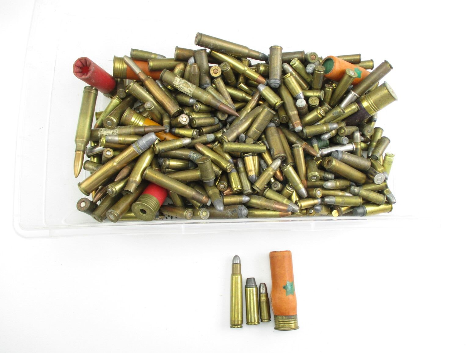 RELOADED ASSORTED AMMO LOT, APPROX 9.8 LBS, VARIOUS CALIBERS INCLUDING: 8MM, .45 COLT, 10 GAUGE, 7.63 MAUSER, ETC., LOT MAY INCLUDE BRASS, PRIMED BRASS, DAMAGED RNDS, ETC., THERE ARE NEW SHIPPING RESTRICTIONS, PLEASE MAKE SURE YOU HAVE READ AND CONFIRMED WE CAN SHIP TO YOU BEFORE BIDDING ON THIS LOT. PLEASE SEE LOT 0 IN THIS SESSION. NO REFUNDS WILL BE ISSUED, OR BIDS RETRACTED, THIS IS NON FACTORY RELOADS. IT IS BEING SOLD AS COMPONENTS ONLY. USE OTHER THAN DESCRIBED IS COMPLETELY AT YOUR RISK.