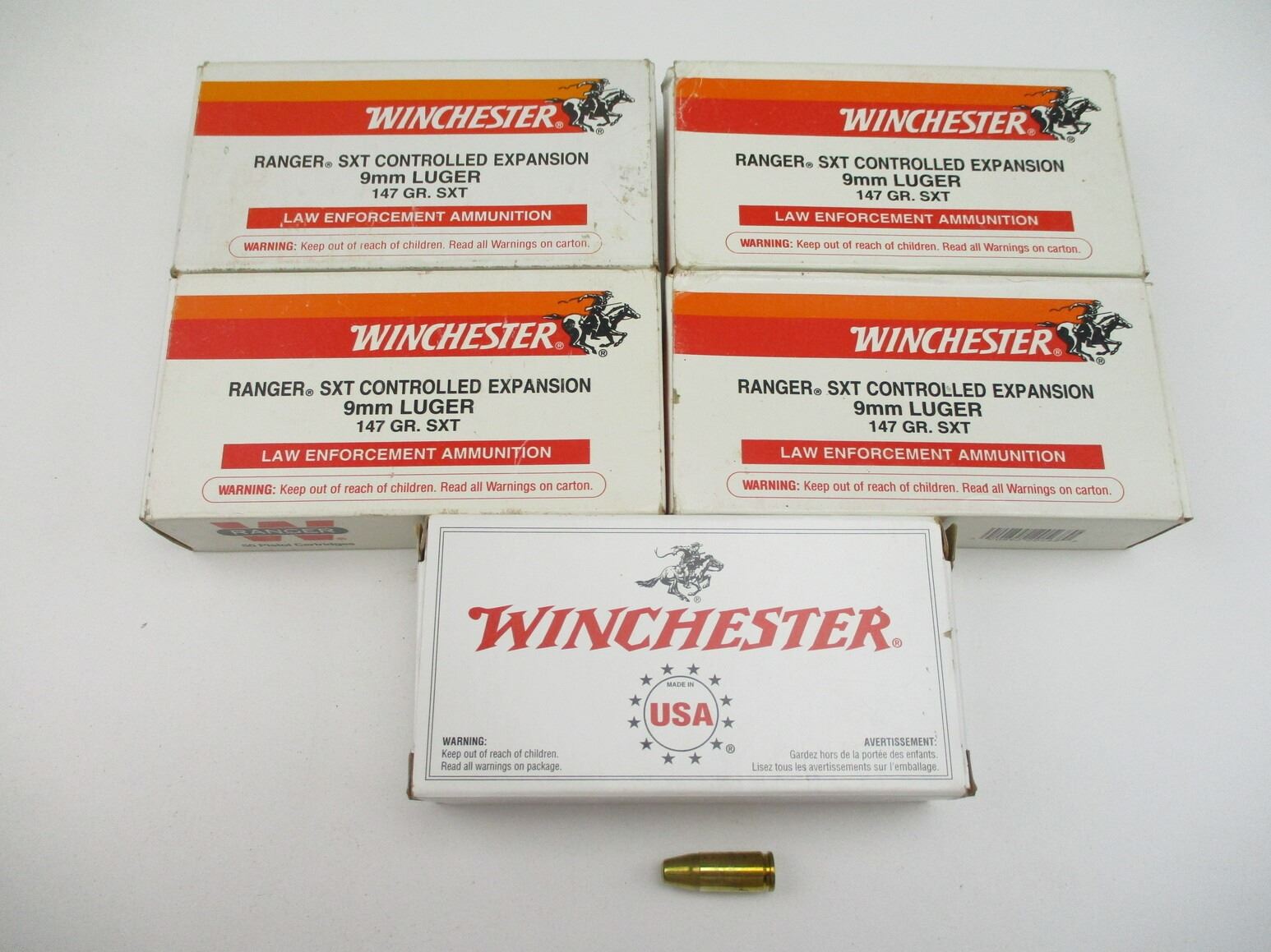 WINCHESTER 9MM LUGER AMMO, 250 RNDS, 147 GRNS (STATED ON BOX, NOT CONFIRMED), SXT, MAY INCLUDE OTHER MFG'S, THERE ARE NEW SHIPPING RESTRICTIONS, PLEASE MAKE SURE YOU HAVE READ AND CONFIRMED WE CAN SHIP TO YOU BEFORE BIDDING ON THIS LOT. PLEASE SEE LOT 0 IN THIS SESSION. NO REFUNDS WILL BE ISSUED, OR BIDS RETRACTED