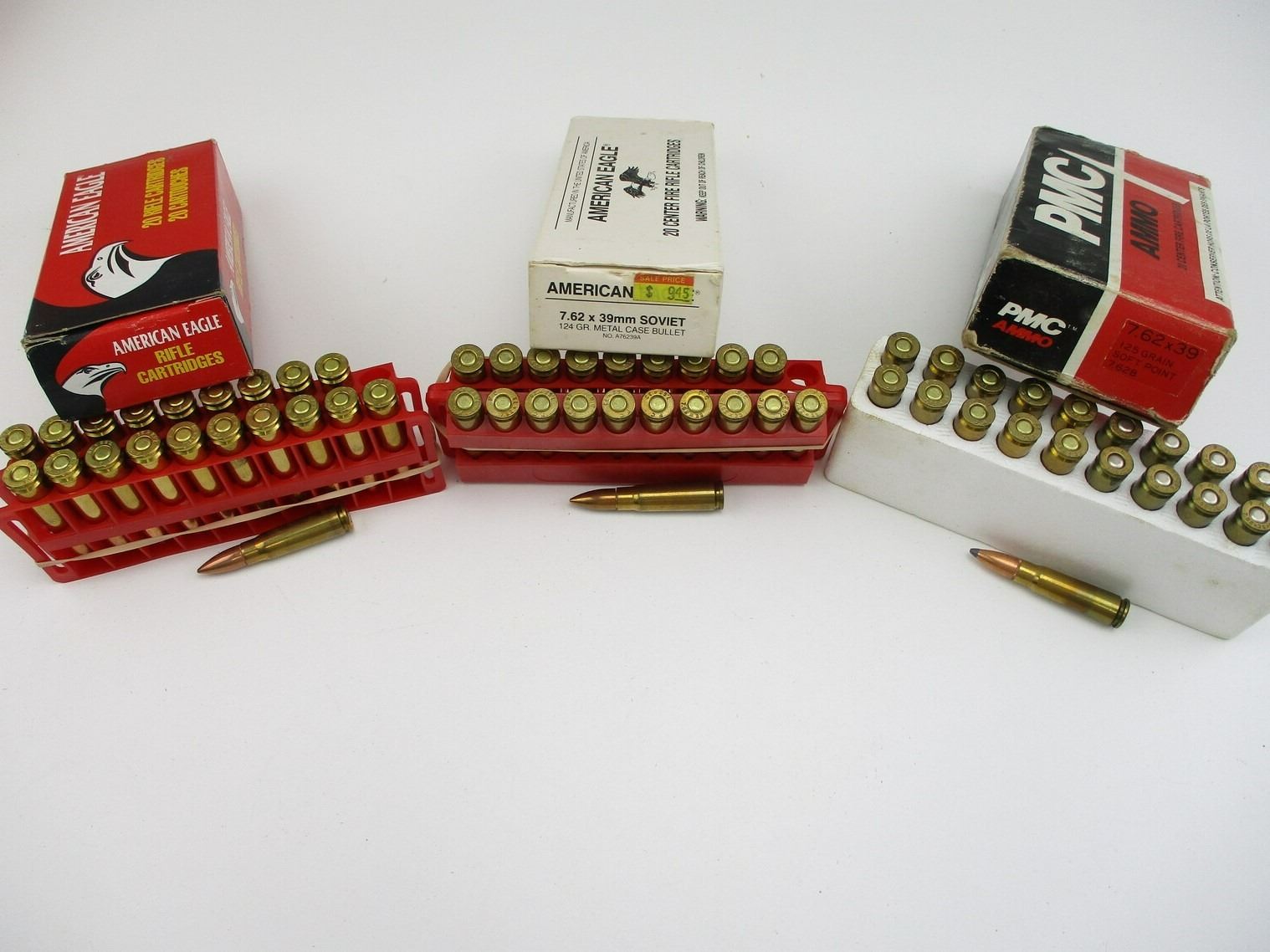 ASSORTED 7.62X39 SOVIET AMMO, 125 RNDS, 15 BRASS, INCLUDES (115) FEDERAL, 124 GRNS (STATED ON BOX, NOT CONFIRMED), & (10) PMC, 125 GRNS (STATED ON BOX, NOT CONFIRMED), THERE ARE NEW SHIPPING RESTRICTIONS, PLEASE MAKE SURE YOU HAVE READ AND CONFIRMED WE CAN SHIP TO YOU BEFORE BIDDING ON THIS LOT. PLEASE SEE LOT 0 IN THIS SESSION. NO REFUNDS WILL BE ISSUED, OR BIDS RETRACTED