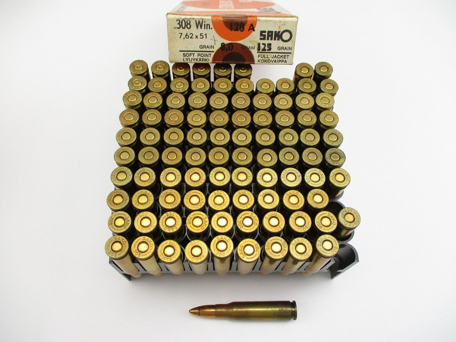 SAKO .308 WIN AMMO, 84 RNDS, 13 BRASS, 125 GRNS (STATED ON BOX, NOT CONFIRMED), FMJ, THERE ARE NEW SHIPPING RESTRICTIONS, PLEASE MAKE SURE YOU HAVE READ AND CONFIRMED WE CAN SHIP TO YOU BEFORE BIDDING ON THIS LOT. PLEASE SEE LOT 0 IN THIS SESSION. NO REFUNDS WILL BE ISSUED, OR BIDS RETRACTED