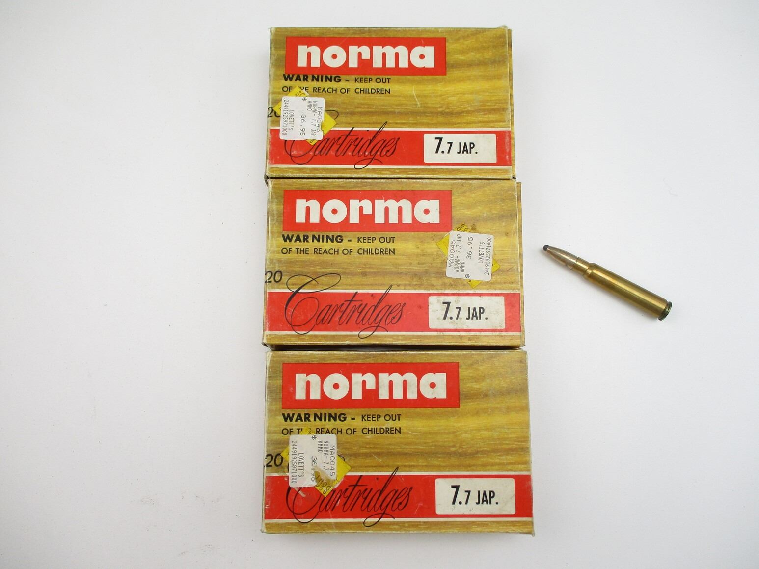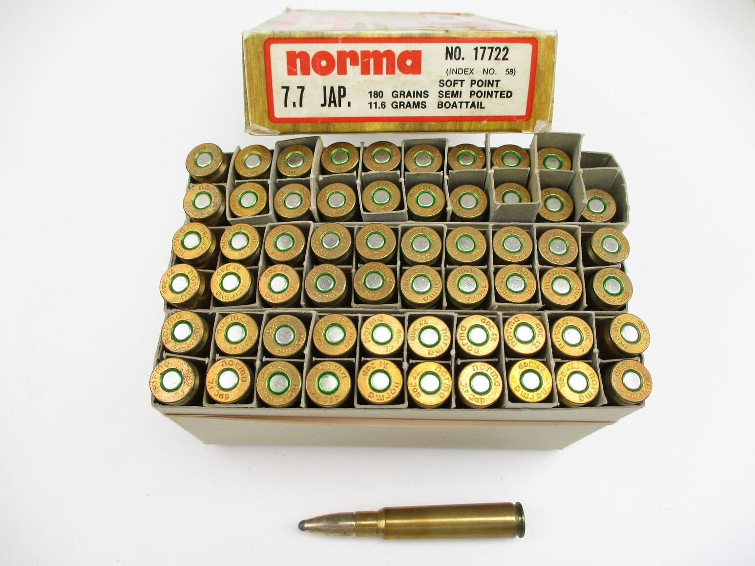 NORMA 7.7 JAP AMMO LOT, 60 RNDS, 180 GRNS (STATED ON BOX, NOT CONFIRMED), SP, SEMI POINTED, BOAT TAIL, THERE ARE NEW SHIPPING RESTRICTIONS, PLEASE MAKE SURE YOU HAVE READ AND CONFIRMED WE CAN SHIP TO YOU BEFORE BIDDING ON THIS LOT. PLEASE SEE LOT 0 IN THIS SESSION. NO REFUNDS WILL BE ISSUED, OR BIDS RETRACTED