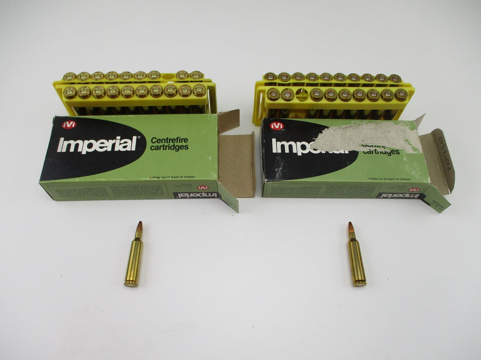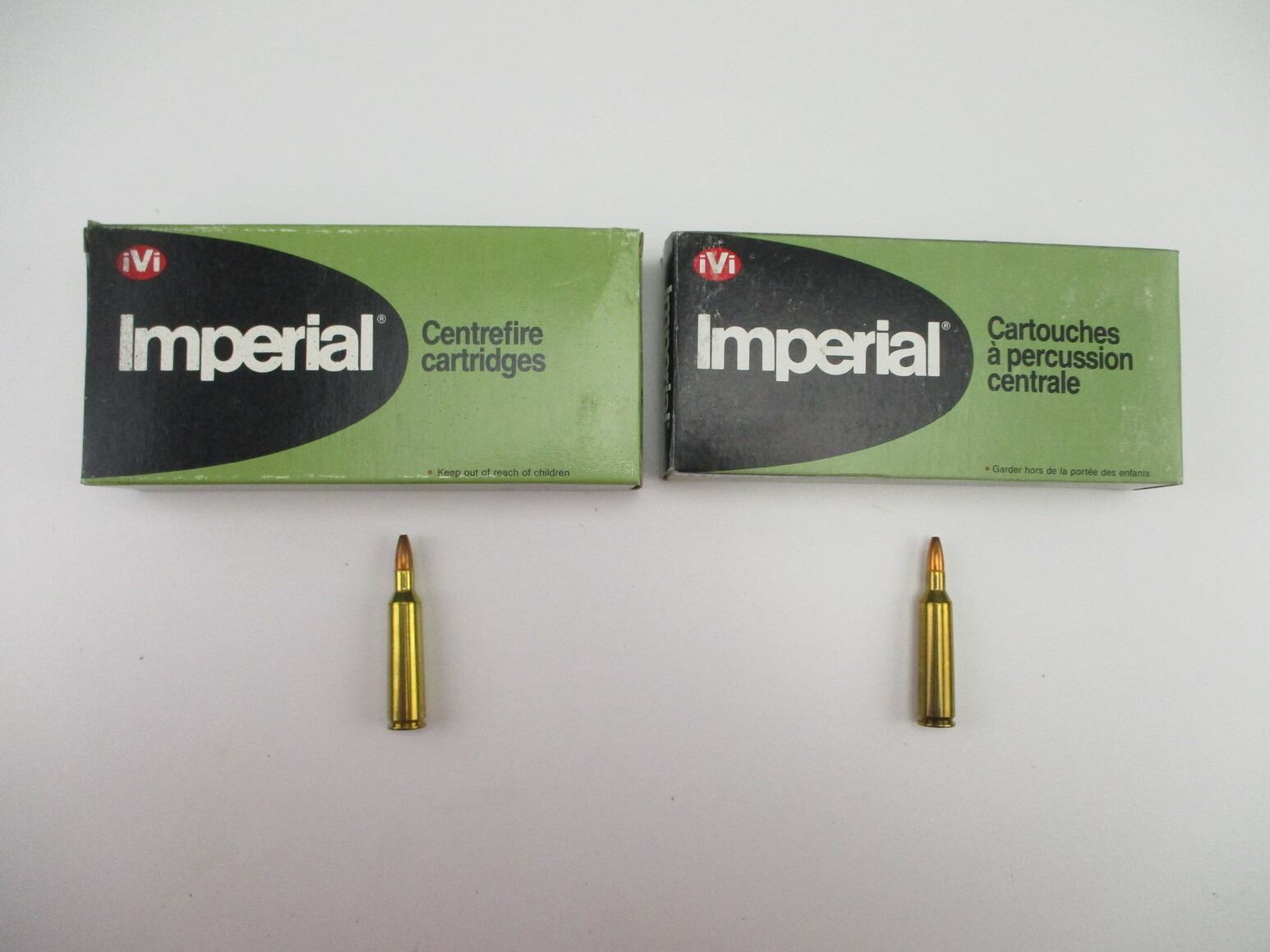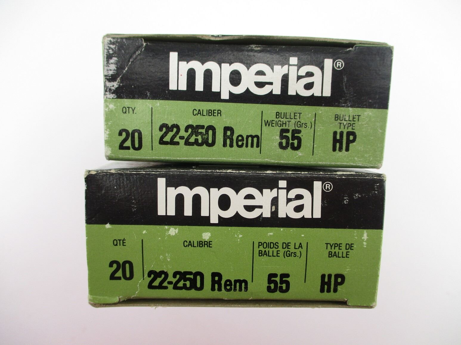 IMPERIAL .22-250 REM AMMO LOT, 40 RNDS, HP, 55 GRNS (STATED ON BOXES, NOT CONFIRMED), CENTRE FIRE, THERE ARE NEW SHIPPING RESTRICTIONS, PLEASE MAKE SURE YOU HAVE READ AND CONFIRMED WE CAN SHIP TO YOU BEFORE BIDDING ON THIS LOT. PLEASE SEE LOT 0 IN THIS SESSION. NO REFUNDS WILL BE ISSUED, OR BIDS RETRACTED
