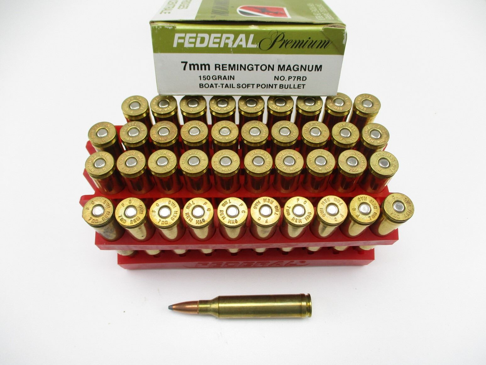FEDERAL 7MM REM MAGNUM AMMO LOT, 40 RNDS, 150 GRNS (STATED ON BOXES, NOT CONFIRMED), SP BOAT TAIL, THERE ARE NEW SHIPPING RESTRICTIONS, PLEASE MAKE SURE YOU HAVE READ AND CONFIRMED WE CAN SHIP TO YOU BEFORE BIDDING ON THIS LOT. PLEASE SEE LOT 0 IN THIS SESSION. NO REFUNDS WILL BE ISSUED, OR BIDS RETRACTED