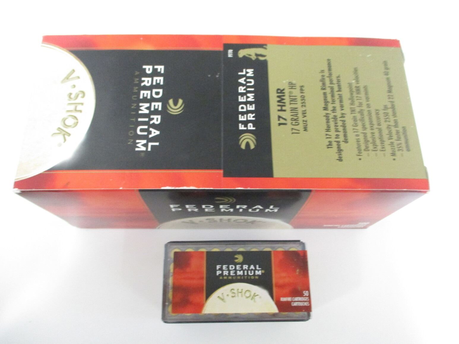 FEDERAL .17 HMR AMMO, 500 RNDS, 17 GRNS (STATED ON BOX, NOT CONFIRMED), TNT HP, THERE ARE NEW SHIPPING RESTRICTIONS, PLEASE MAKE SURE YOU HAVE READ AND CONFIRMED WE CAN SHIP TO YOU BEFORE BIDDING ON THIS LOT. PLEASE SEE LOT 0 IN THIS SESSION. NO REFUNDS WILL BE ISSUED, OR BIDS RETRACTED