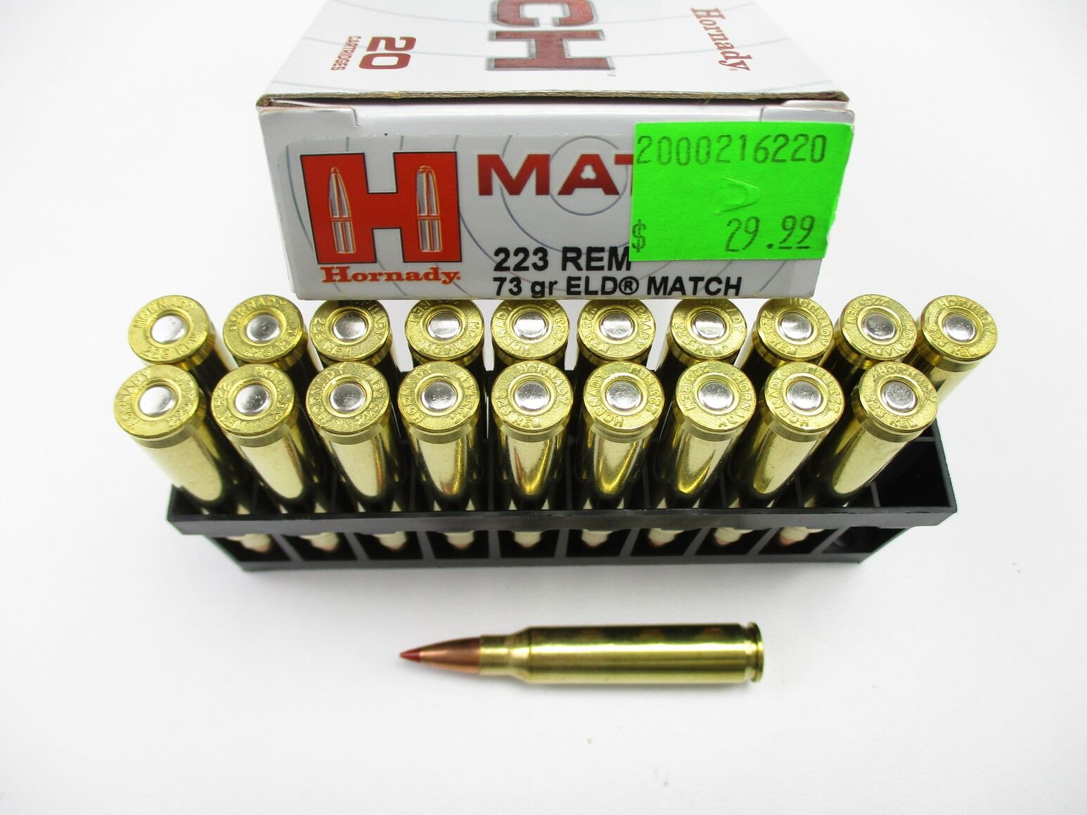 HORNADY MATCH .223 REM AMMO, 100 RNDS, 73 GRNS (STATED ON BOX, NOT CONFIRMED), ELD MATCH, THERE ARE NEW SHIPPING RESTRICTIONS, PLEASE MAKE SURE YOU HAVE READ AND CONFIRMED WE CAN SHIP TO YOU BEFORE BIDDING ON THIS LOT. PLEASE SEE LOT 0 IN THIS SESSION. NO REFUNDS WILL BE ISSUED, OR BIDS RETRACTED