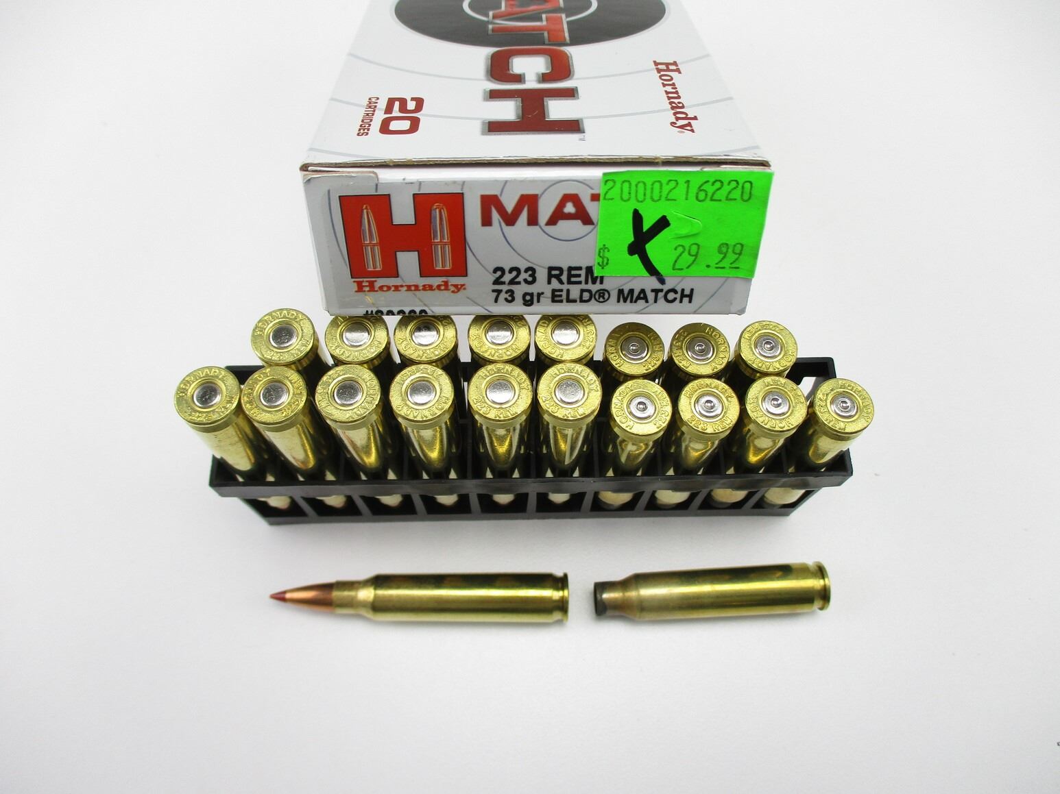 HORNADY MATCH .223 REM AMMO, 72 RNDS, 8 BRASS, 73 GRNS (STATED ON BOX, NOT CONFIRMED), ELD MATCH, THERE ARE NEW SHIPPING RESTRICTIONS, PLEASE MAKE SURE YOU HAVE READ AND CONFIRMED WE CAN SHIP TO YOU BEFORE BIDDING ON THIS LOT. PLEASE SEE LOT 0 IN THIS SESSION. NO REFUNDS WILL BE ISSUED, OR BIDS RETRACTED