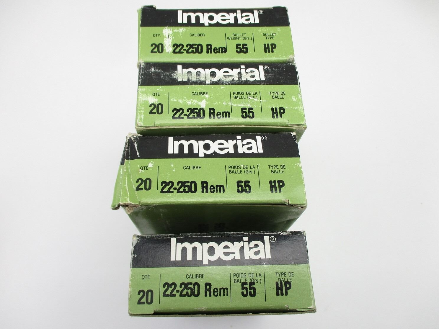 IMPERIAL .22-250 REM AMMO, 80 RNDS, 55 GRNS (STATED ON BOX, NOT CONFIRMED, HOLLOW POINT, THERE ARE NEW SHIPPING RESTRICTIONS, PLEASE MAKE SURE YOU HAVE READ AND CONFIRMED WE CAN SHIP TO YOU BEFORE BIDDING ON THIS LOT. PLEASE SEE LOT 0 IN THIS SESSION. NO REFUNDS WILL BE ISSUED, OR BIDS RETRACTED