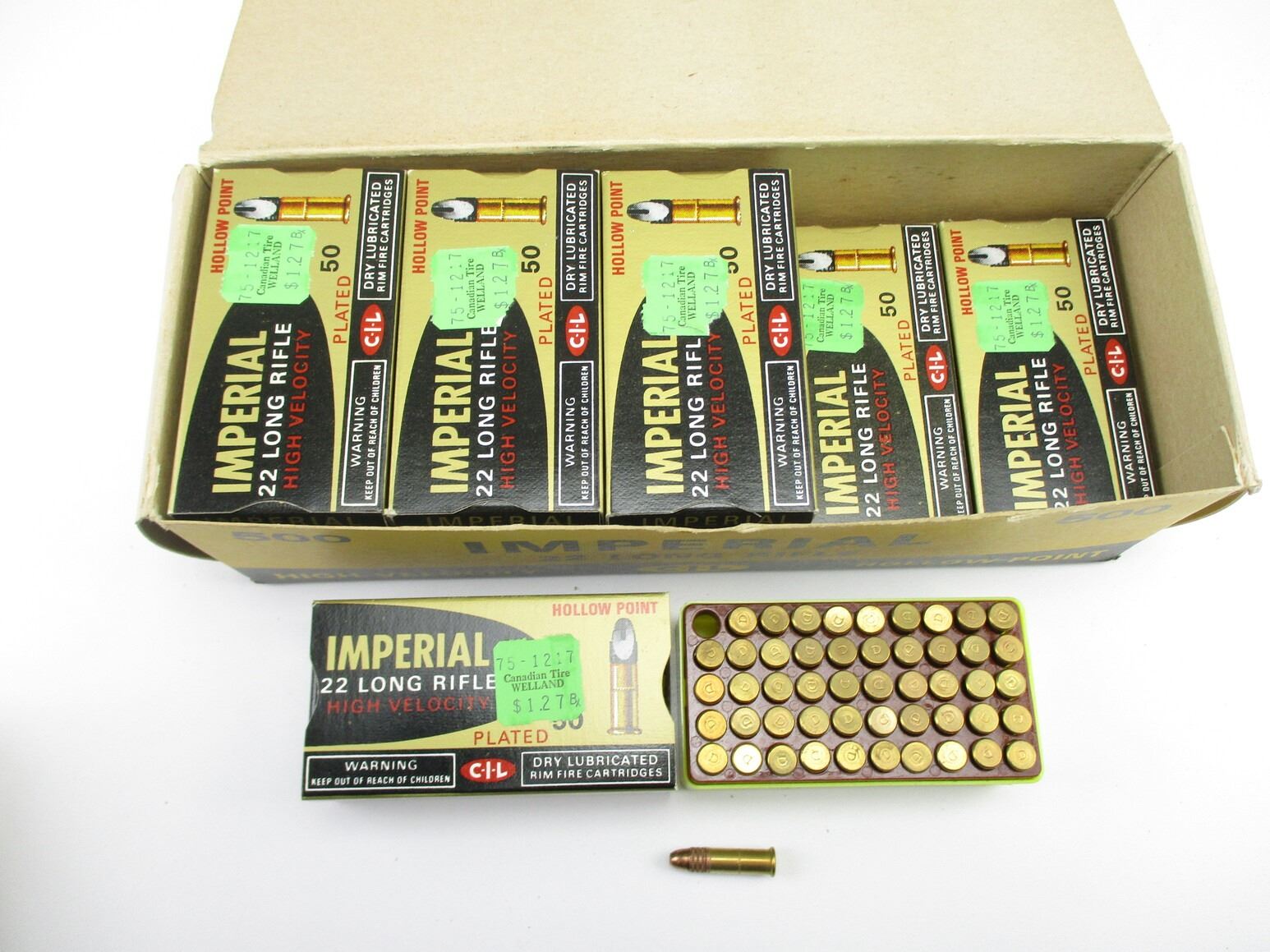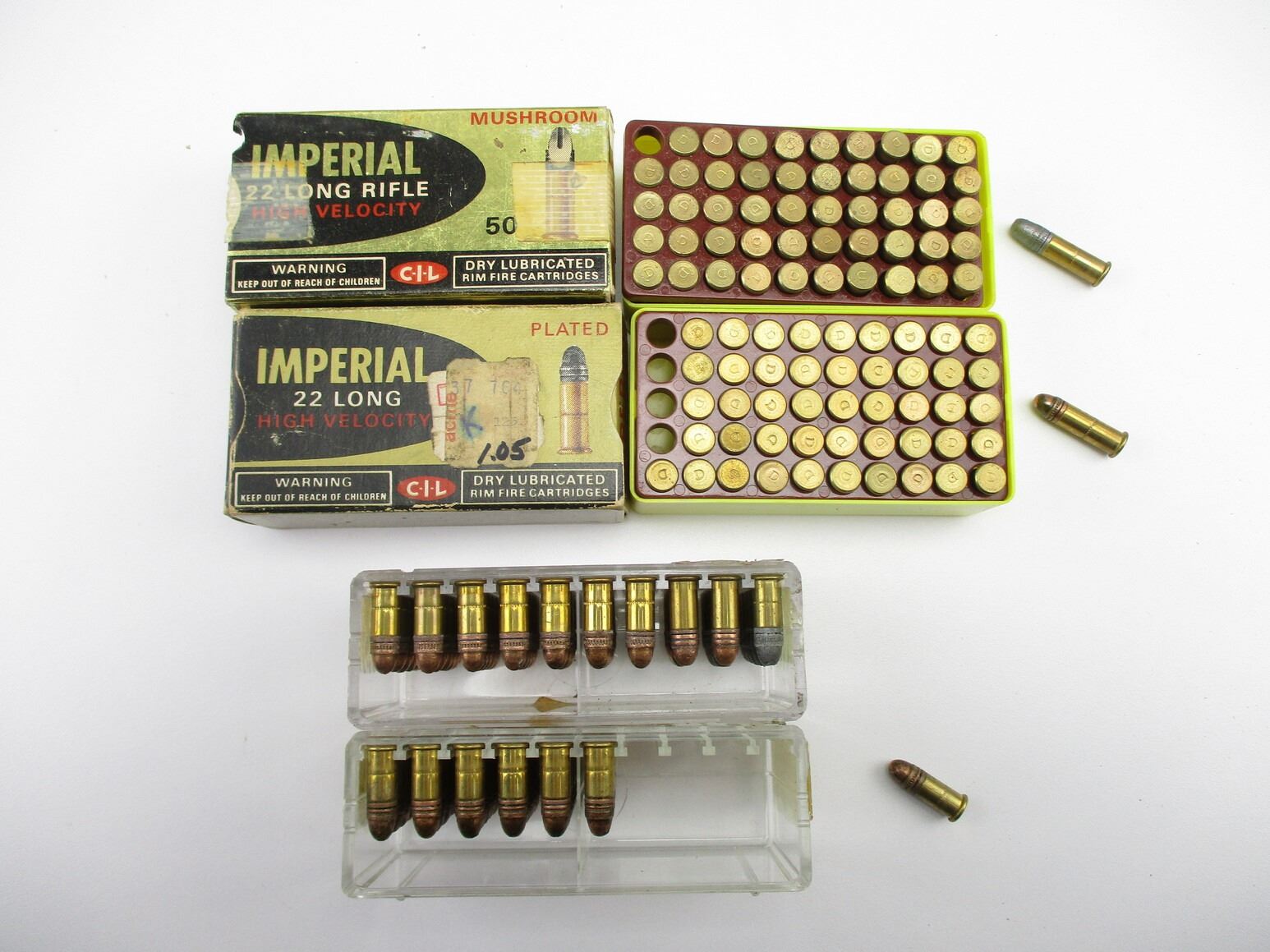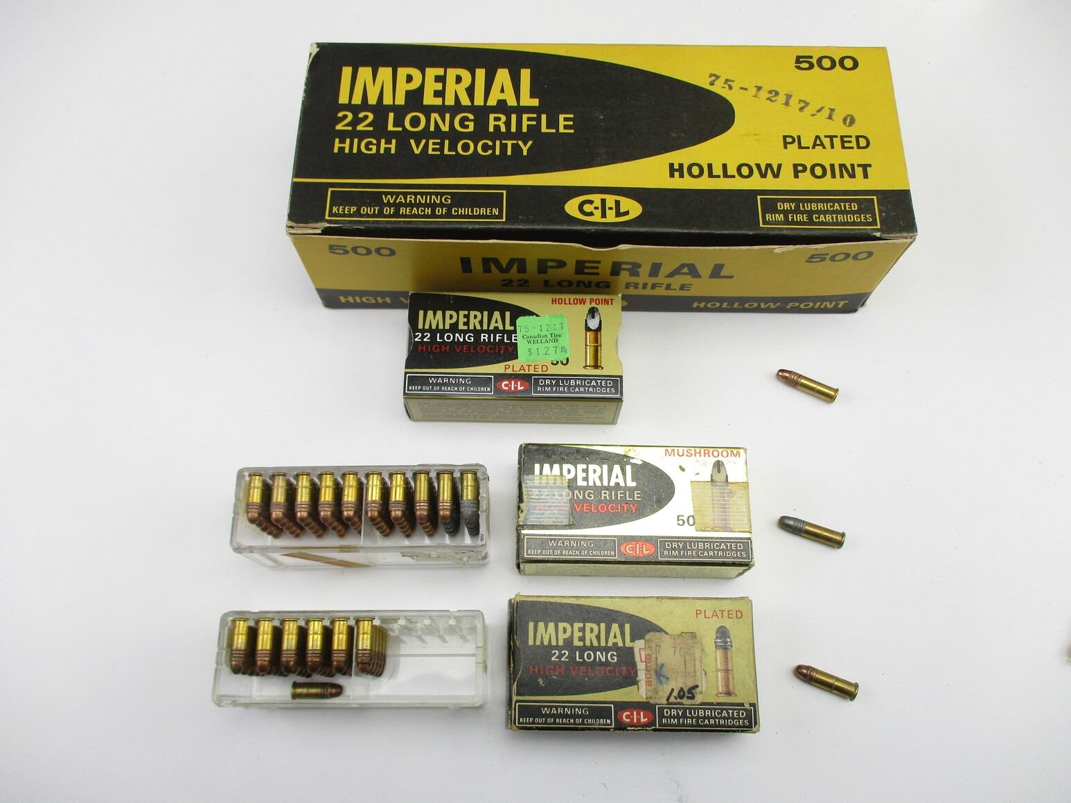 CIL IMPERIAL ASSORTED .22 AMMO, APPROX 600 RNDS, LOT INCLUDES: .22 LONG RIFLE, .22 LONG, .22 SHORT, VARIOUS BULLET TYPES INCLUDING: HOLLOW POINT, MUSHROOM, SOLID BULLET, ETC., THERE ARE NEW SHIPPING RESTRICTIONS, PLEASE MAKE SURE YOU HAVE READ AND CONFIRMED WE CAN SHIP TO YOU BEFORE BIDDING ON THIS LOT. PLEASE SEE LOT 0 IN THIS SESSION. NO REFUNDS WILL BE ISSUED, OR BIDS RETRACTED