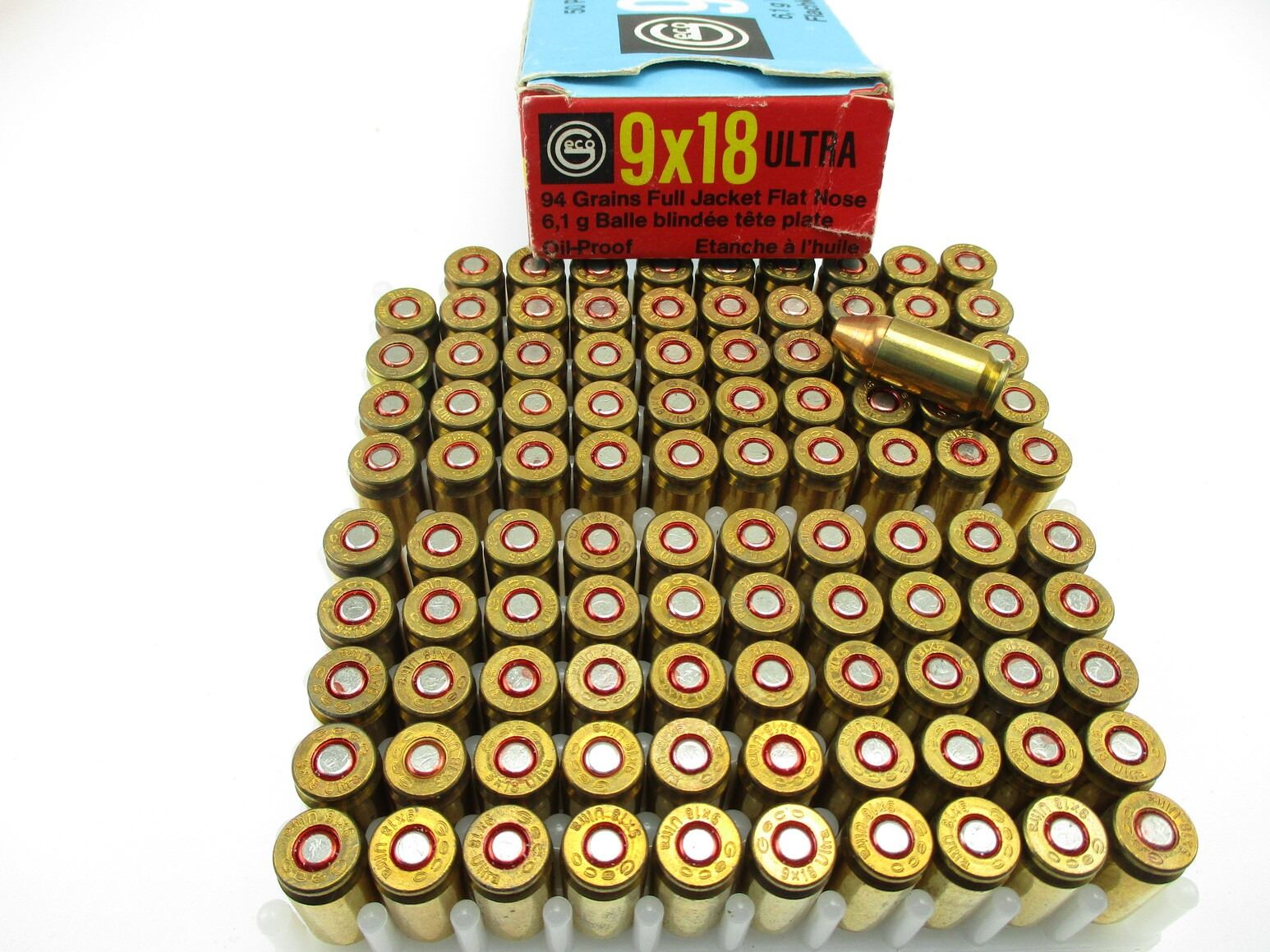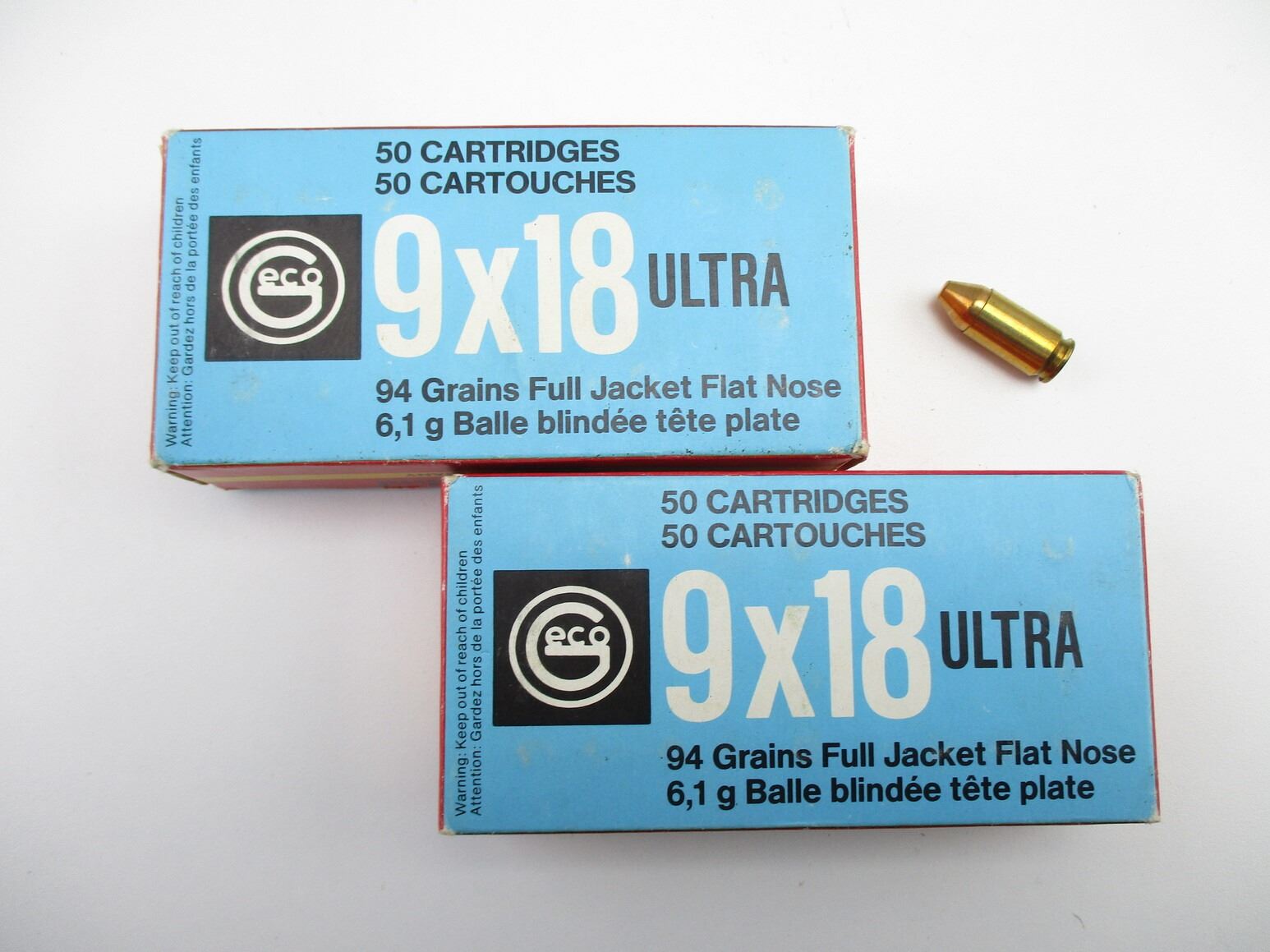 GECO 9X18 ULTRA AMMO, 100 RNDS, 94 GRNS (STATED ON BOX, NOT CONFIRMED), FULL JACKET FLAT NOSE, THERE ARE NEW SHIPPING RESTRICTIONS, PLEASE MAKE SURE YOU HAVE READ AND CONFIRMED WE CAN SHIP TO YOU BEFORE BIDDING ON THIS LOT. PLEASE SEE LOT 0 IN THIS SESSION. NO REFUNDS WILL BE ISSUED, OR BIDS RETRACTED