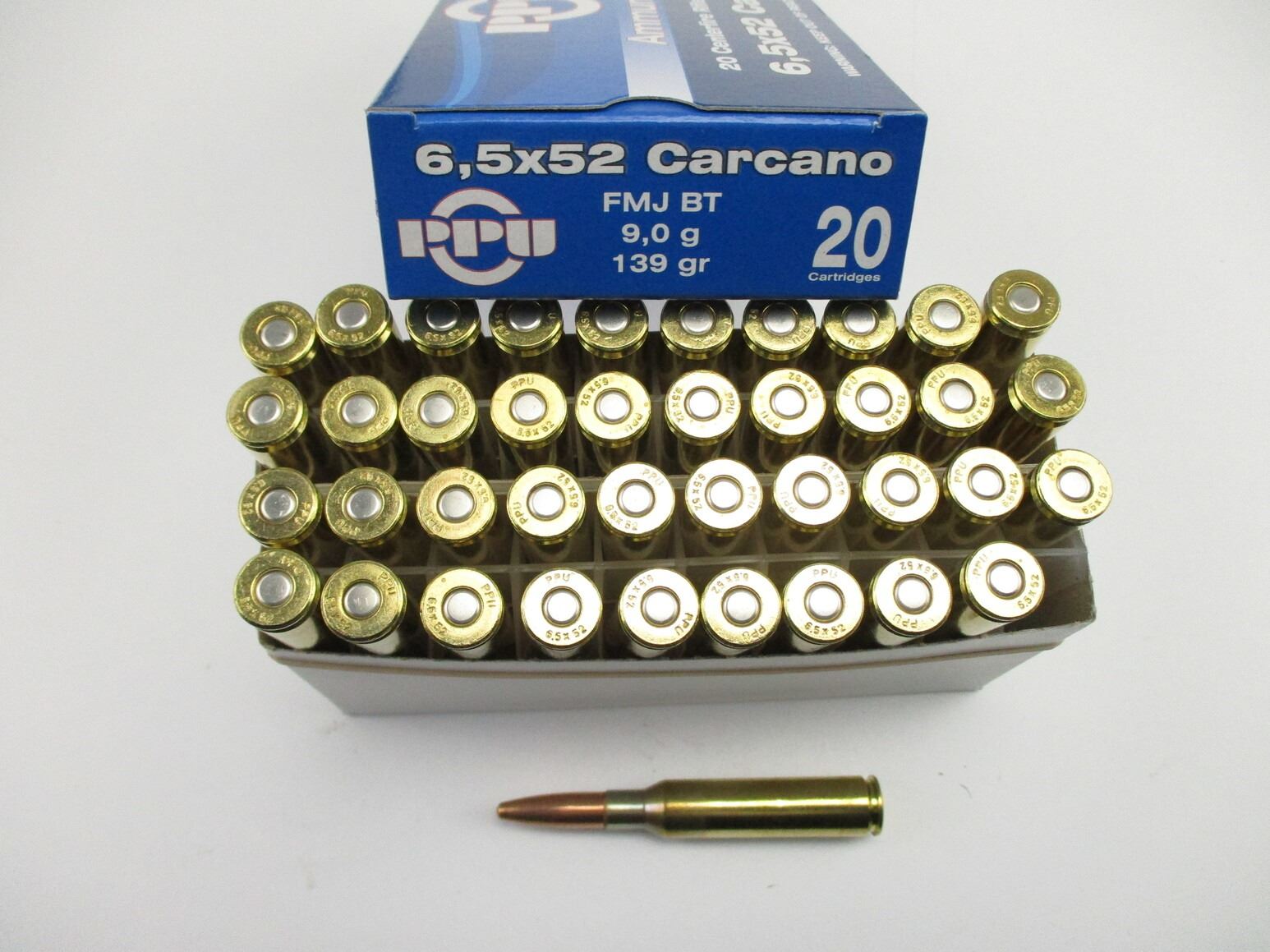 PPU 6.5X52 CARCANO AMMO, 40 RNDS, 139 GRNS (STATED ON BOX, NOT CONFIRMED), FMJ BT, THERE ARE NEW SHIPPING RESTRICTIONS, PLEASE MAKE SURE YOU HAVE READ AND CONFIRMED WE CAN SHIP TO YOU BEFORE BIDDING ON THIS LOT. PLEASE SEE LOT 0 IN THIS SESSION. NO REFUNDS WILL BE ISSUED, OR BIDS RETRACTED