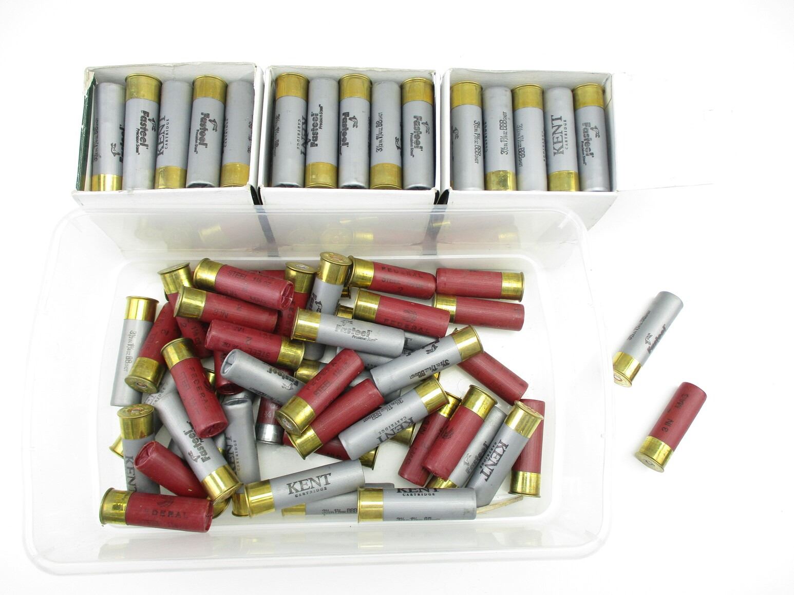 ASSORTED 12 GAUGE SHOTSHELLS LOT, 121 RNDS, 3" & 3 1/2", LOT INCLUDES KENT, & FEDERAL MFG'S, THERE ARE NEW SHIPPING RESTRICTIONS, PLEASE MAKE SURE YOU HAVE READ AND CONFIRMED WE CAN SHIP TO YOU BEFORE BIDDING ON THIS LOT. PLEASE SEE LOT 0 IN THIS SESSION. NO REFUNDS WILL BE ISSUED, OR BIDS RETRACTED