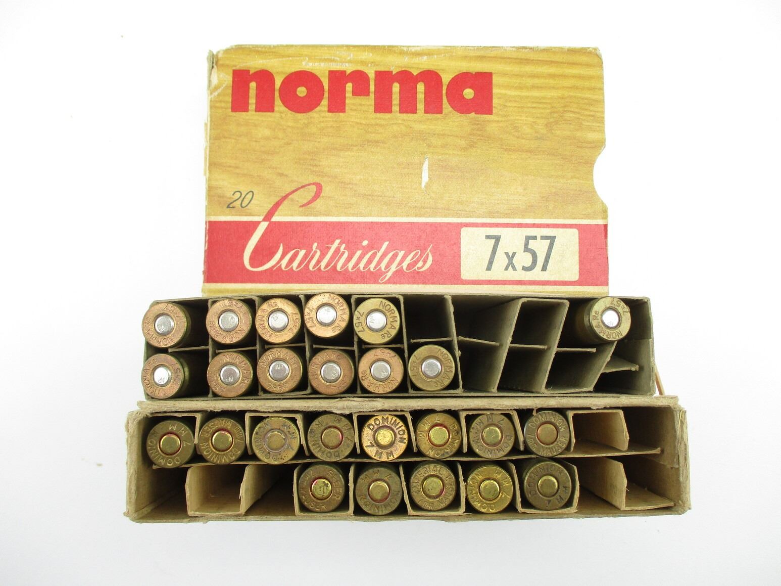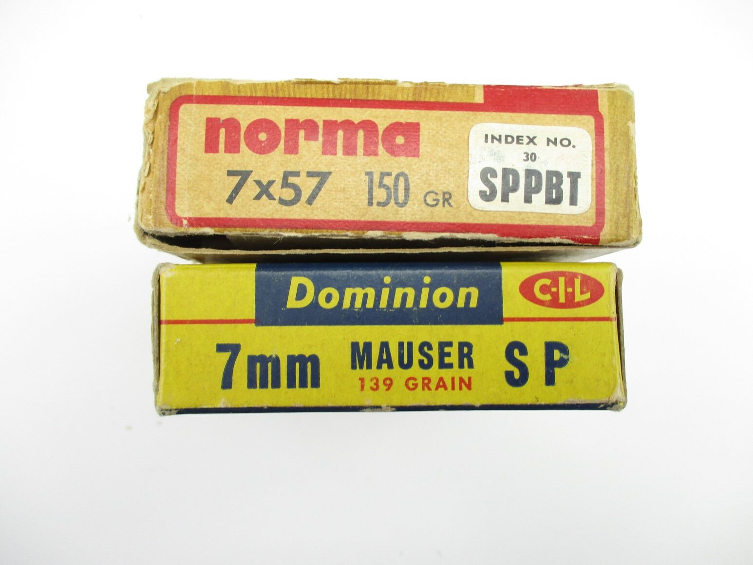 ASSORTED 7MM MAUSER AMMO, 25 RNDS, LOT INCLUDES (13) DOMINION, 139 GRNS (STATED ON BOX, NOT CONFIRMED), SOFT POINT, & (12) NORMA, 150 GRNS (STATED ON BOX, NOT CONFIRMED), SPPBT, THERE ARE NEW SHIPPING RESTRICTIONS, PLEASE MAKE SURE YOU HAVE READ AND CONFIRMED WE CAN SHIP TO YOU BEFORE BIDDING ON THIS LOT. PLEASE SEE LOT 0 IN THIS SESSION. NO REFUNDS WILL BE ISSUED, OR BIDS RETRACTED