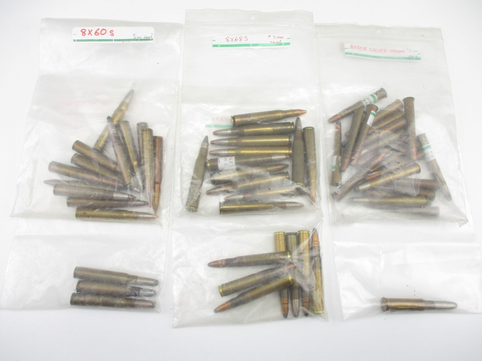 ASSORTED 8MM METRIC AMMO, 56 RNDS, LOT INCLUDES: 8X50R, 8X58R SAUER, 8X60 MAUSER, 8X64S BRENNEKE, & 8X68S, THERE ARE NEW SHIPPING RESTRICTIONS, PLEASE MAKE SURE YOU HAVE READ AND CONFIRMED WE CAN SHIP TO YOU BEFORE BIDDING ON THIS LOT. PLEASE SEE LOT 0 IN THIS SESSION. NO REFUNDS WILL BE ISSUED, OR BIDS RETRACTED