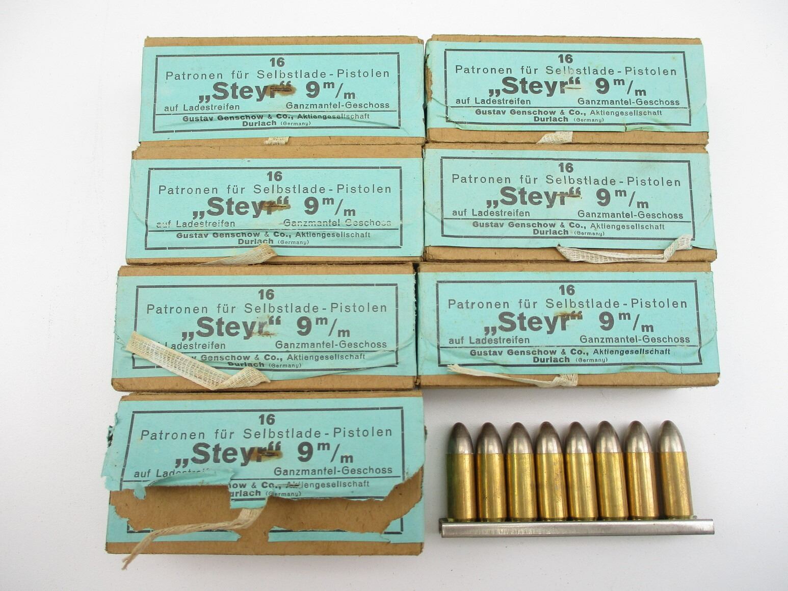 MILITARY GECO 9MM STEYR AMMO LOT, 112 RNDS ON STRIPPER CLIPS, GERMAN, SIX UNOPENED PKGS, THERE ARE NEW SHIPPING RESTRICTIONS, PLEASE MAKE SURE YOU HAVE READ AND CONFIRMED WE CAN SHIP TO YOU BEFORE BIDDING ON THIS LOT. PLEASE SEE LOT 0 IN THIS SESSION. NO REFUNDS WILL BE ISSUED, OR BIDS RETRACTED