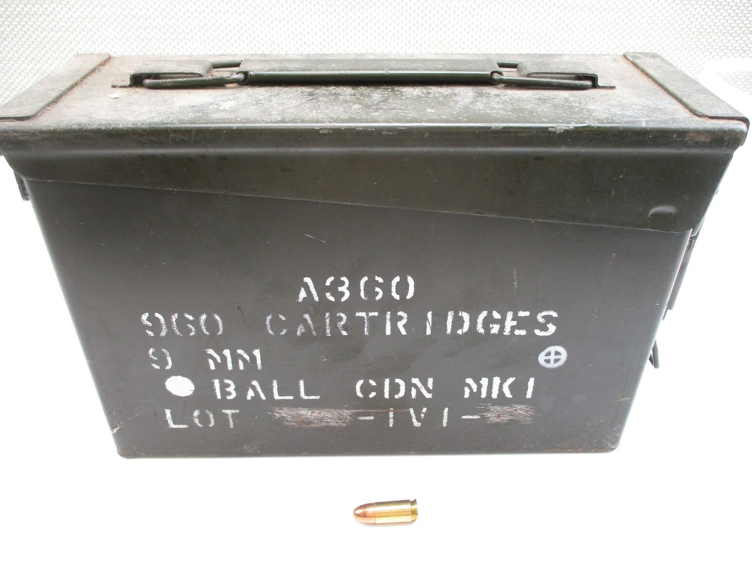 MILITARY 9MM LUGER AMMO LOT, 740 RNDS, CANADIAN, IVI, VARIOUS DATES, MAY CONTAIN OTHER RNDS, METAL AMMO TIN, VARIOUS MARKINGS, THERE ARE NEW SHIPPING RESTRICTIONS, PLEASE MAKE SURE YOU HAVE READ AND CONFIRMED WE CAN SHIP TO YOU BEFORE BIDDING ON THIS LOT. PLEASE SEE LOT 0 IN THIS SESSION. NO REFUNDS WILL BE ISSUED, OR BIDS RETRACTED