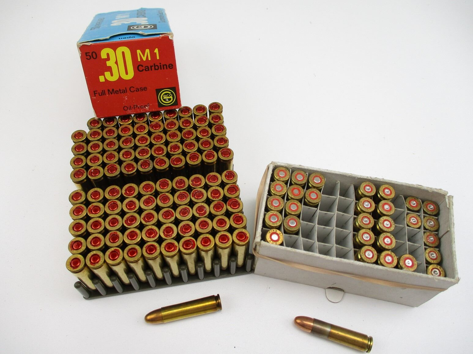 MILITARY ASSORTED .30 M1 CARBINE AMMO LOT, 123 RNDS, 11 HAVE PRIMERS STRUCK, 7 BRASS, FMJ, GECO & PRVI, THERE ARE NEW SHIPPING RESTRICTIONS, PLEASE MAKE SURE YOU HAVE READ AND CONFIRMED WE CAN SHIP TO YOU BEFORE BIDDING ON THIS LOT. PLEASE SEE LOT 0 IN THIS SESSION. NO REFUNDS WILL BE ISSUED, OR BIDS RETRACTED