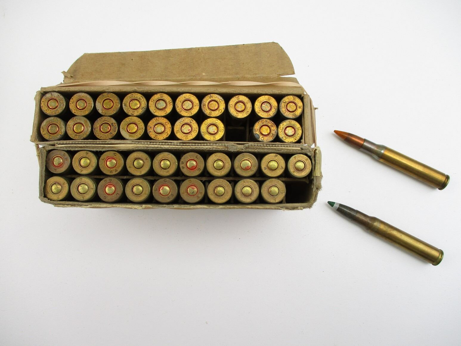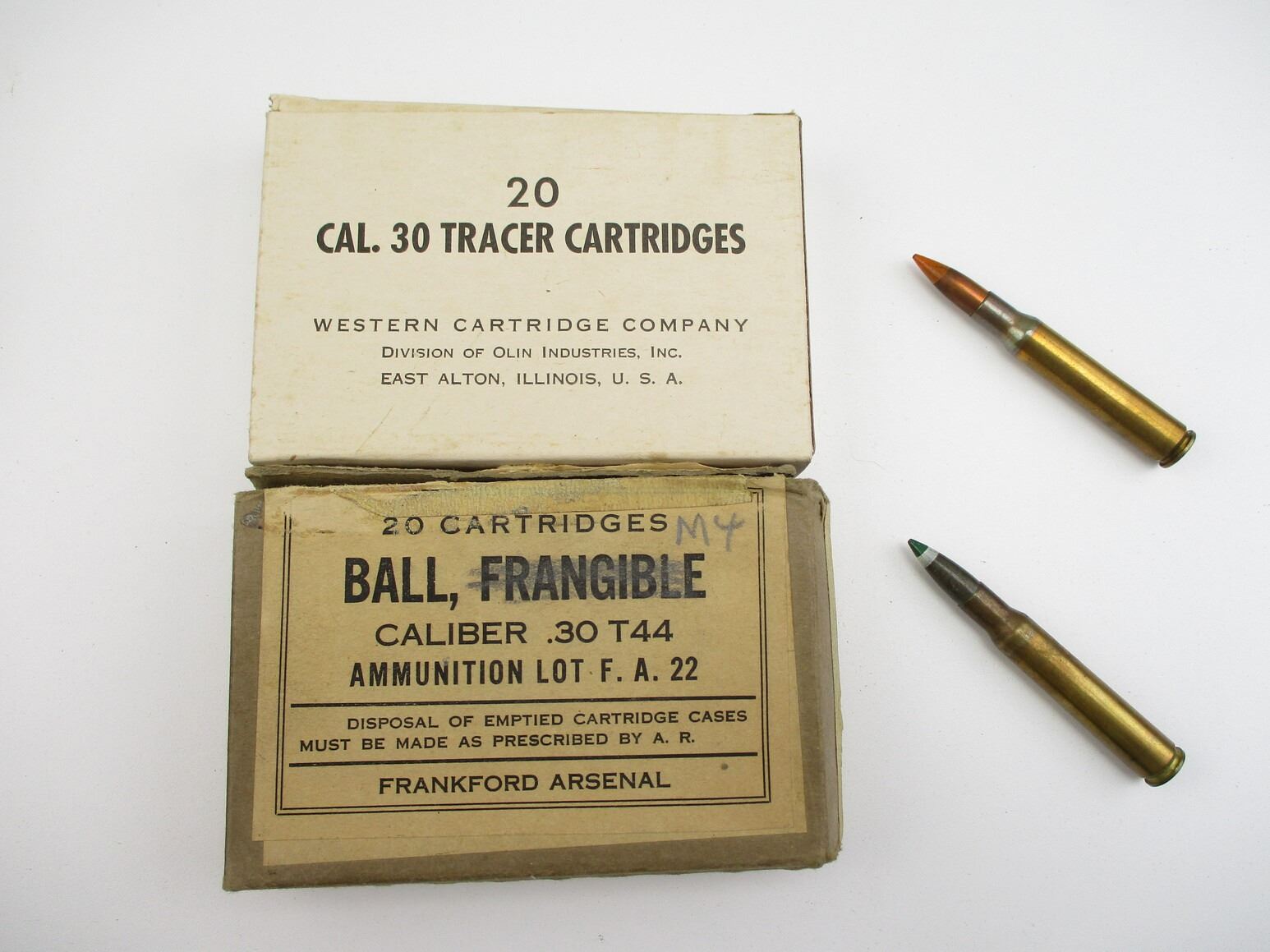 MILITARY .30 TRACER AMMO LOT, 40 RNDS, INCLUDES 20 FRANGIBLE IN ORIGINAL FRANKFORD ARSENAL PKG, WESTERN CARTRIDGE CO., THERE ARE NEW SHIPPING RESTRICTIONS, PLEASE MAKE SURE YOU HAVE READ AND CONFIRMED WE CAN SHIP TO YOU BEFORE BIDDING ON THIS LOT. PLEASE SEE LOT 0 IN THIS SESSION. NO REFUNDS WILL BE ISSUED, OR BIDS RETRACTED
