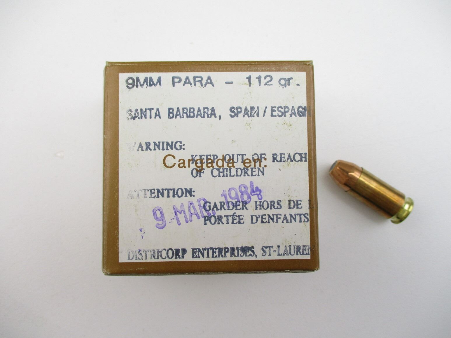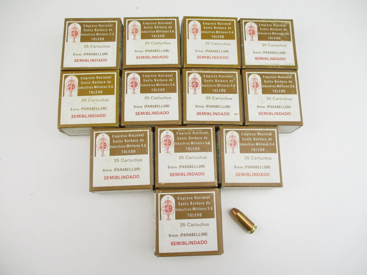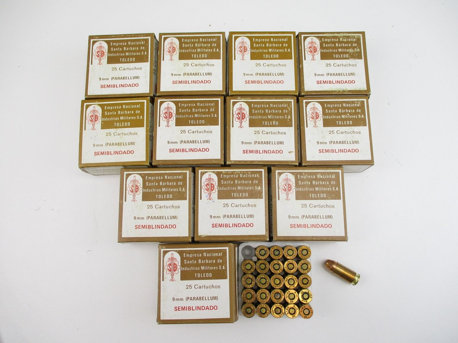 MILITARY 9MM LUGER AMMO LOT, 299 RNDS, 112 GRNS (STATED ON BOXES, NOT CONFIRMED), EMPRESA NACIONAL, THERE ARE NEW SHIPPING RESTRICTIONS, PLEASE MAKE SURE YOU HAVE READ AND CONFIRMED WE CAN SHIP TO YOU BEFORE BIDDING ON THIS LOT. PLEASE SEE LOT 0 IN THIS SESSION. NO REFUNDS WILL BE ISSUED, OR BIDS RETRACTED