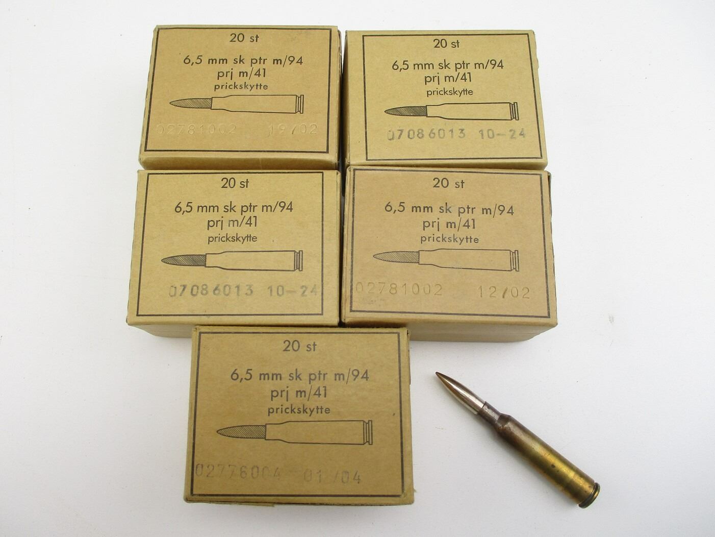 MILITARY 6.5X55 SWEDISH AMMO LOT, 95 RNDS, FOUR UNOPENED BOXES, THERE ARE NEW SHIPPING RESTRICTIONS, PLEASE MAKE SURE YOU HAVE READ AND CONFIRMED WE CAN SHIP TO YOU BEFORE BIDDING ON THIS LOT. PLEASE SEE LOT 0 IN THIS SESSION. NO REFUNDS WILL BE ISSUED, OR BIDS RETRACTED