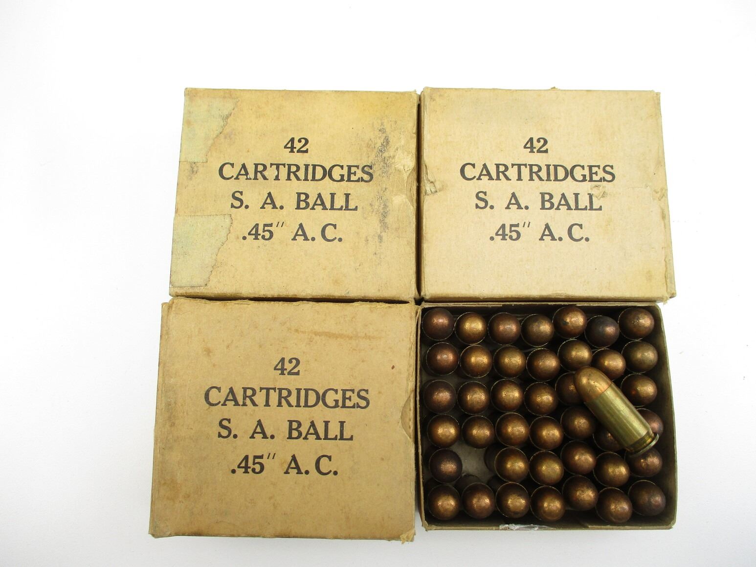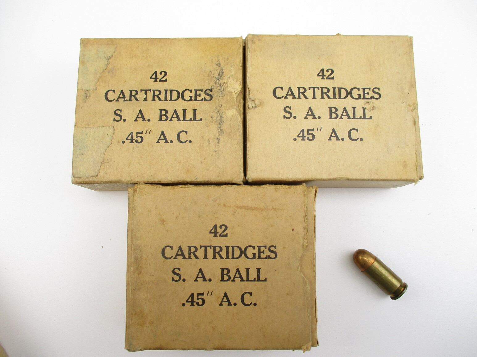 MILITARY .45 ACP U.S. AMMO LOT, 126 RNDS, IN ORIGINAL PKGS, THERE ARE NEW SHIPPING RESTRICTIONS, PLEASE MAKE SURE YOU HAVE READ AND CONFIRMED WE CAN SHIP TO YOU BEFORE BIDDING ON THIS LOT. PLEASE SEE LOT 0 IN THIS SESSION. NO REFUNDS WILL BE ISSUED, OR BIDS RETRACTED