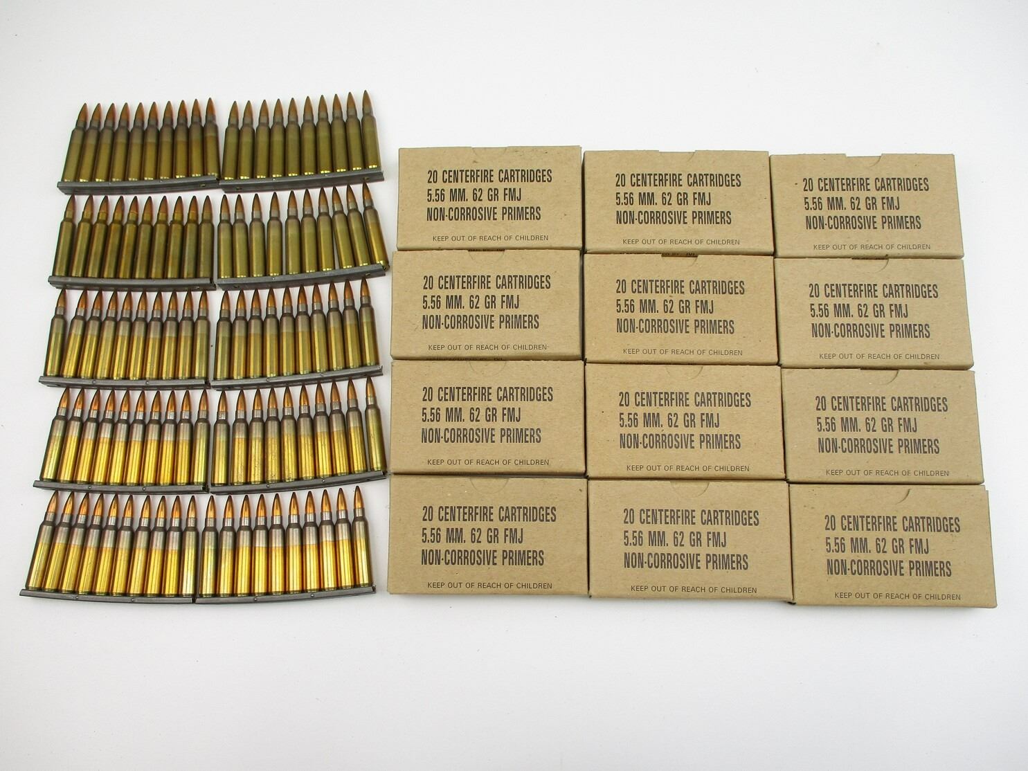 MILITARY 5.56MM CANADIAN AMMO LOT, 340 RNDS, 62 GRNS ( STATED ON BOXES, NOT CONFIRMED), CANADIAN & FNM, VARIOUS YEARS, ON STRIPPER CLIPS WITH MARKINGS, THERE ARE NEW SHIPPING RESTRICTIONS, PLEASE MAKE SURE YOU HAVE READ AND CONFIRMED WE CAN SHIP TO YOU BEFORE BIDDING ON THIS LOT. PLEASE SEE LOT 0 IN THIS SESSION. NO REFUNDS WILL BE ISSUED, OR BIDS RETRACTED