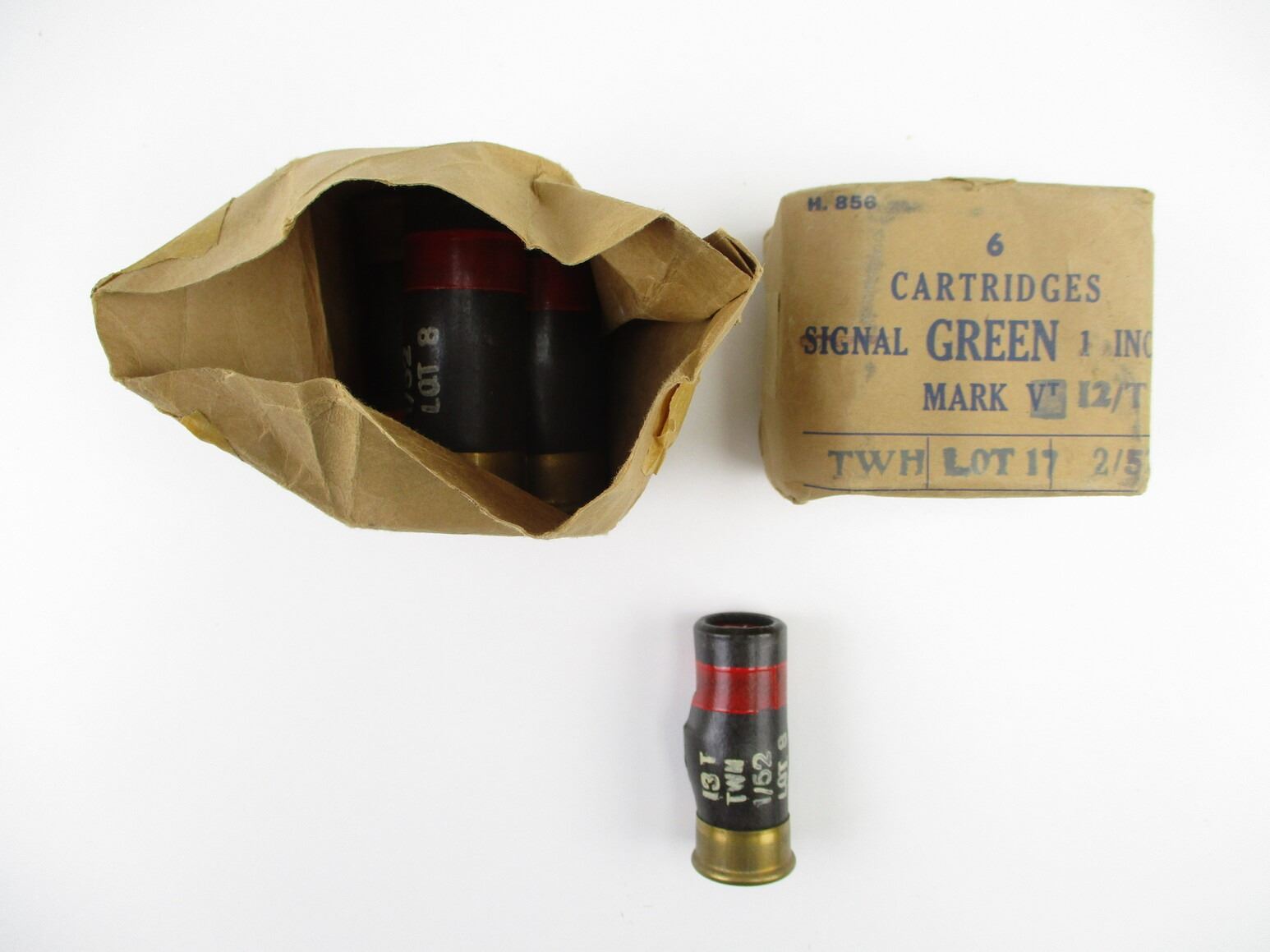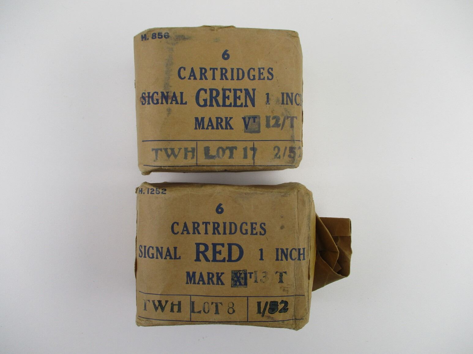 MILITARY U.S. SIGNAL FLARES LOT, 12 FLARES, INCLUDES 6 RED & 6 GREEN FLARES, 1", IN ORIGINAL PKGS DATED 1952, THERE ARE NEW SHIPPING RESTRICTIONS, PLEASE MAKE SURE YOU HAVE READ AND CONFIRMED WE CAN SHIP TO YOU BEFORE BIDDING ON THIS LOT. PLEASE SEE LOT 0 IN THIS SESSION. NO REFUNDS WILL BE ISSUED, OR BIDS RETRACTED