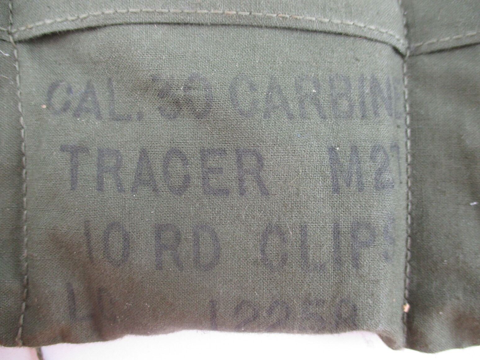 MILITARY .30 M1 TRACERS AMMO AND BANDOLIER LOT, 120 RNDS, (40) RNDS ARE FMJ, (12) STRIPPER CLIPS, VARIOUS MARKINGS ON BANDOLIER, THERE ARE NEW SHIPPING RESTRICTIONS, PLEASE MAKE SURE YOU HAVE READ AND CONFIRMED WE CAN SHIP TO YOU BEFORE BIDDING ON THIS LOT. PLEASE SEE LOT 0 IN THIS SESSION. NO REFUNDS WILL BE ISSUED, OR BIDS RETRACTED