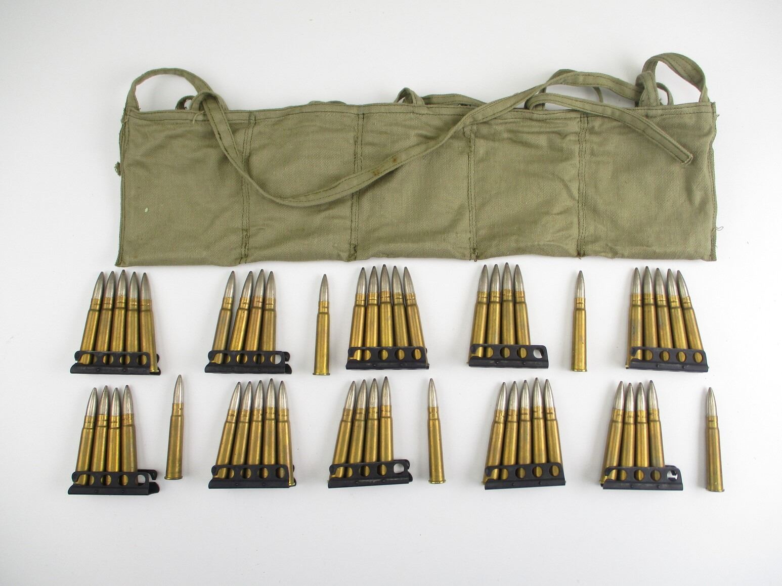 MILITARY .303 BRITISH AMMO AND BANDOLIER LOT, 50 RNDS, 10 STRIPPER CLIPS, THERE ARE NEW SHIPPING RESTRICTIONS, PLEASE MAKE SURE YOU HAVE READ AND CONFIRMED WE CAN SHIP TO YOU BEFORE BIDDING ON THIS LOT. PLEASE SEE LOT 0 IN THIS SESSION. NO REFUNDS WILL BE ISSUED, OR BIDS RETRACTED