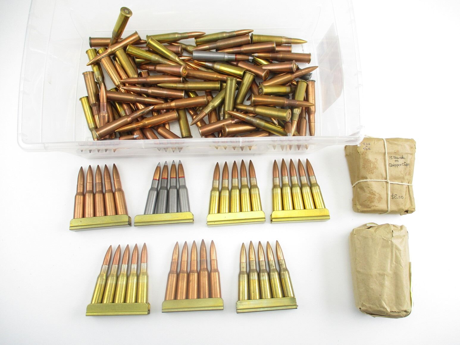 MILITARY ASSORTED 7.62X54R AMMO, 150 RNDS, 10 STRIPPER CLIPS, VARIOUS MFG'S, VARIOUS DATES, THERE ARE NEW SHIPPING RESTRICTIONS, PLEASE MAKE SURE YOU HAVE READ AND CONFIRMED WE CAN SHIP TO YOU BEFORE BIDDING ON THIS LOT. PLEASE SEE LOT 0 IN THIS SESSION. NO REFUNDS WILL BE ISSUED, OR BIDS RETRACTED