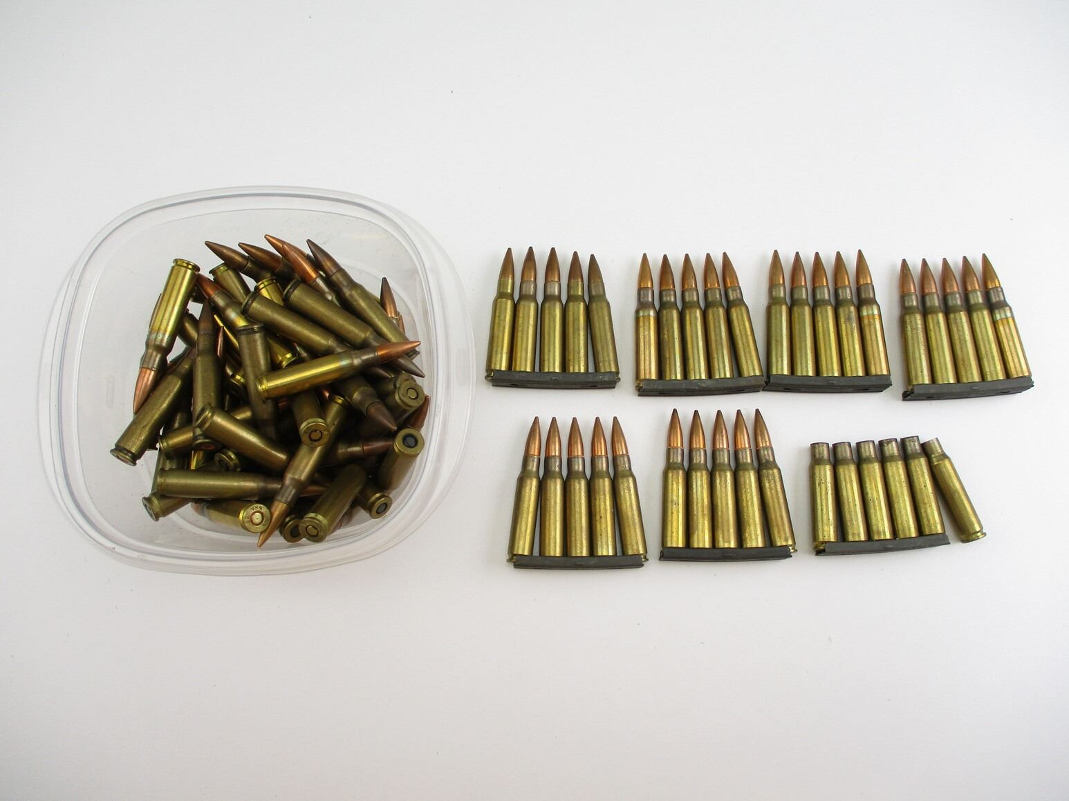 MILITARY ASSORTED 7.62 NATO AMMO, 93 RNDS, 6 BRASS, 7 STRIPPER CLIPS, VARIOUS MFG'S, VARIOUS DATES INCLUDING: 1963, 1965, 1969, ETC., THERE ARE NEW SHIPPING RESTRICTIONS, PLEASE MAKE SURE YOU HAVE READ AND CONFIRMED WE CAN SHIP TO YOU BEFORE BIDDING ON THIS LOT. PLEASE SEE LOT 0 IN THIS SESSION. NO REFUNDS WILL BE ISSUED, OR BIDS RETRACTED
