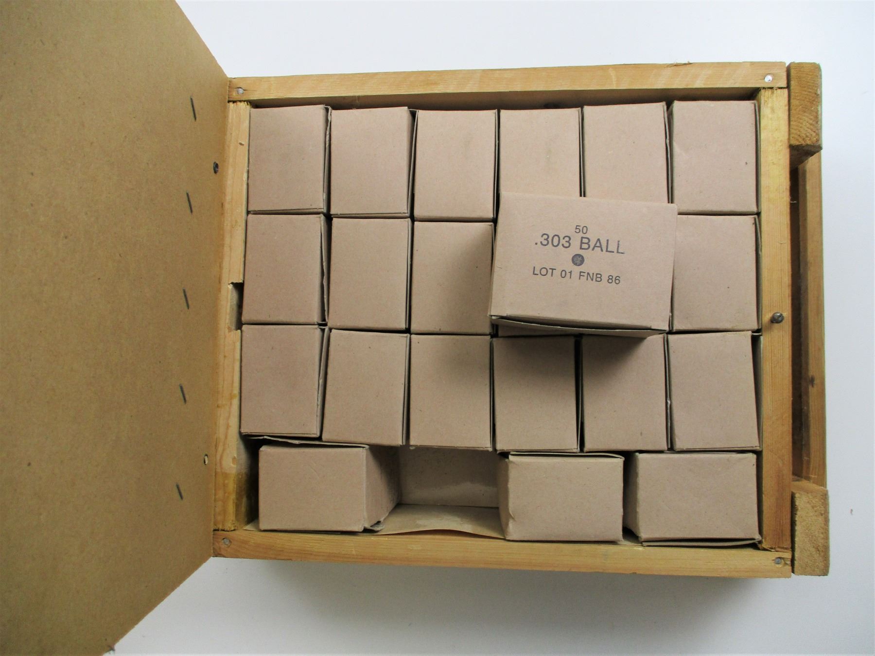 MILITARY FNB .303 BRITISH AMMO WOODEN CRATE LOT, APPROX 1000 RNDS, APPROX 14" X 18" X 5.5", THIS IS 303 BR ( THE CRATE IS MARKED 7.62 X 39, IT IS NOT!!)THERE ARE NEW SHIPPING RESTRICTIONS, PLEASE MAKE SURE YOU HAVE READ AND CONFIRMED WE CAN SHIP TO YOU BEFORE BIDDING ON THIS LOT. PLEASE SEE LOT 0 IN THIS SESSION. NO REFUNDS WILL BE ISSUED, OR BIDS RETRACTED
