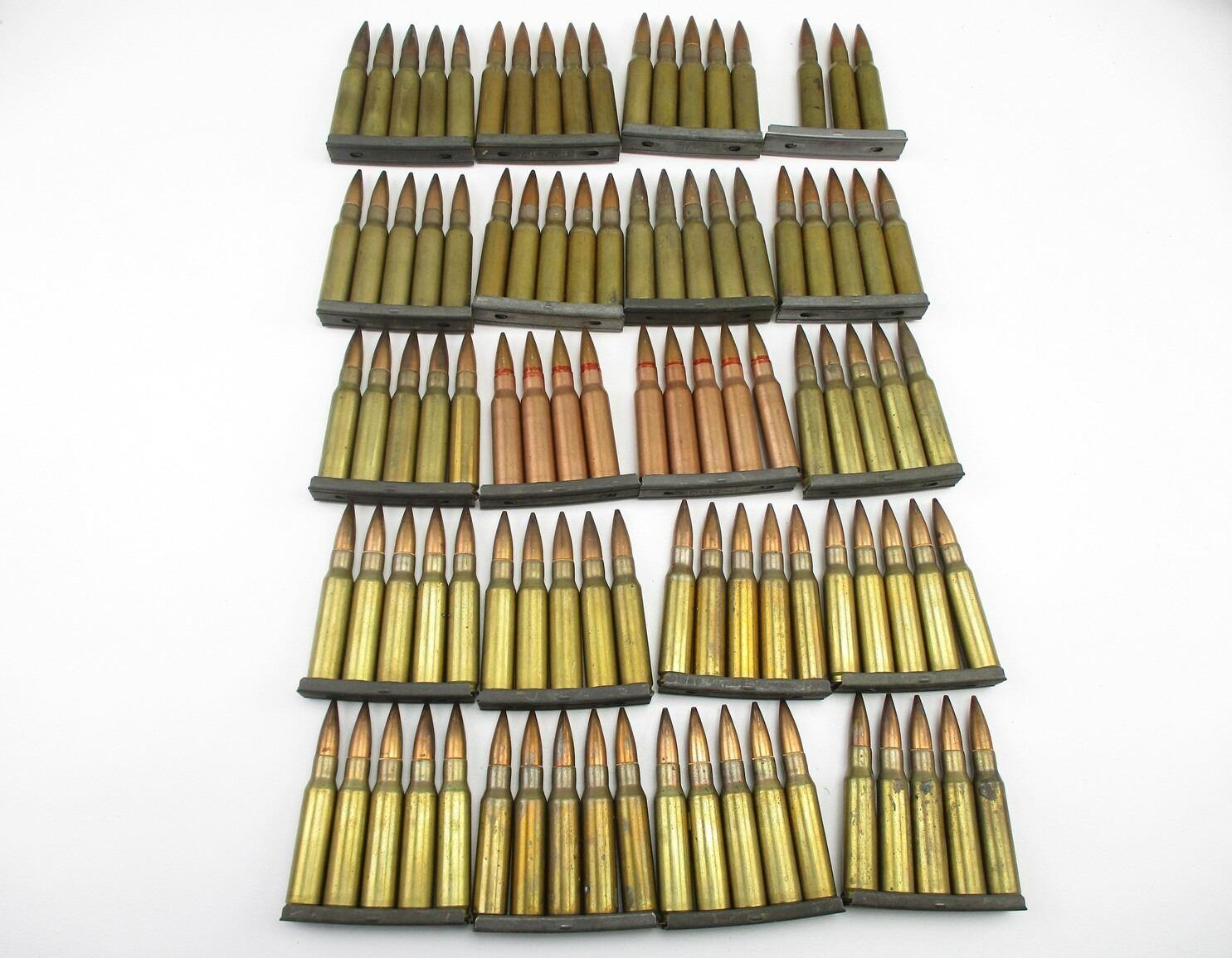 MILITARY ASSORTED 7.62 NATO AMMO, 97 RNDS, 20 STRIPPER CLIPS, VARIOUS MFG'S, VARIOUS DATES INCLUDING: 1969, 1966, 1964, ETC., THERE ARE NEW SHIPPING RESTRICTIONS, PLEASE MAKE SURE YOU HAVE READ AND CONFIRMED WE CAN SHIP TO YOU BEFORE BIDDING ON THIS LOT. PLEASE SEE LOT 0 IN THIS SESSION. NO REFUNDS WILL BE ISSUED, OR BIDS RETRACTED