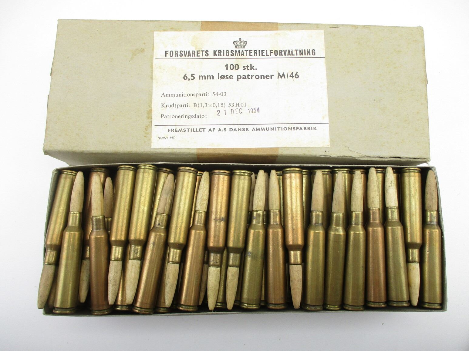 MILITARY SWEDISH 6.5MM AMMO, APPROX 100 RNDS, WOODEN BULLETS, DATED 21 DEC 1954, THERE ARE NEW SHIPPING RESTRICTIONS, PLEASE MAKE SURE YOU HAVE READ AND CONFIRMED WE CAN SHIP TO YOU BEFORE BIDDING ON THIS LOT. PLEASE SEE LOT 0 IN THIS SESSION. NO REFUNDS WILL BE ISSUED, OR BIDS RETRACTED