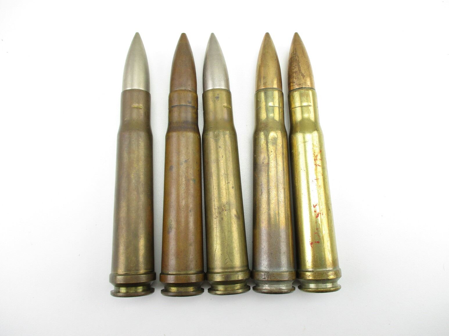 MILITARY WWII .55 BOYES ANTI-TANK AMMO, 3 RNDS, 2 DUMMY RNDS, INCLUDES SOME BRITISH AND CANADIAN ARMOR PIERCING, THERE ARE NEW SHIPPING RESTRICTIONS, PLEASE MAKE SURE YOU HAVE READ AND CONFIRMED WE CAN SHIP TO YOU BEFORE BIDDING ON THIS LOT. PLEASE SEE LOT 0 IN THIS SESSION. NO REFUNDS WILL BE ISSUED, OR BIDS RETRACTED