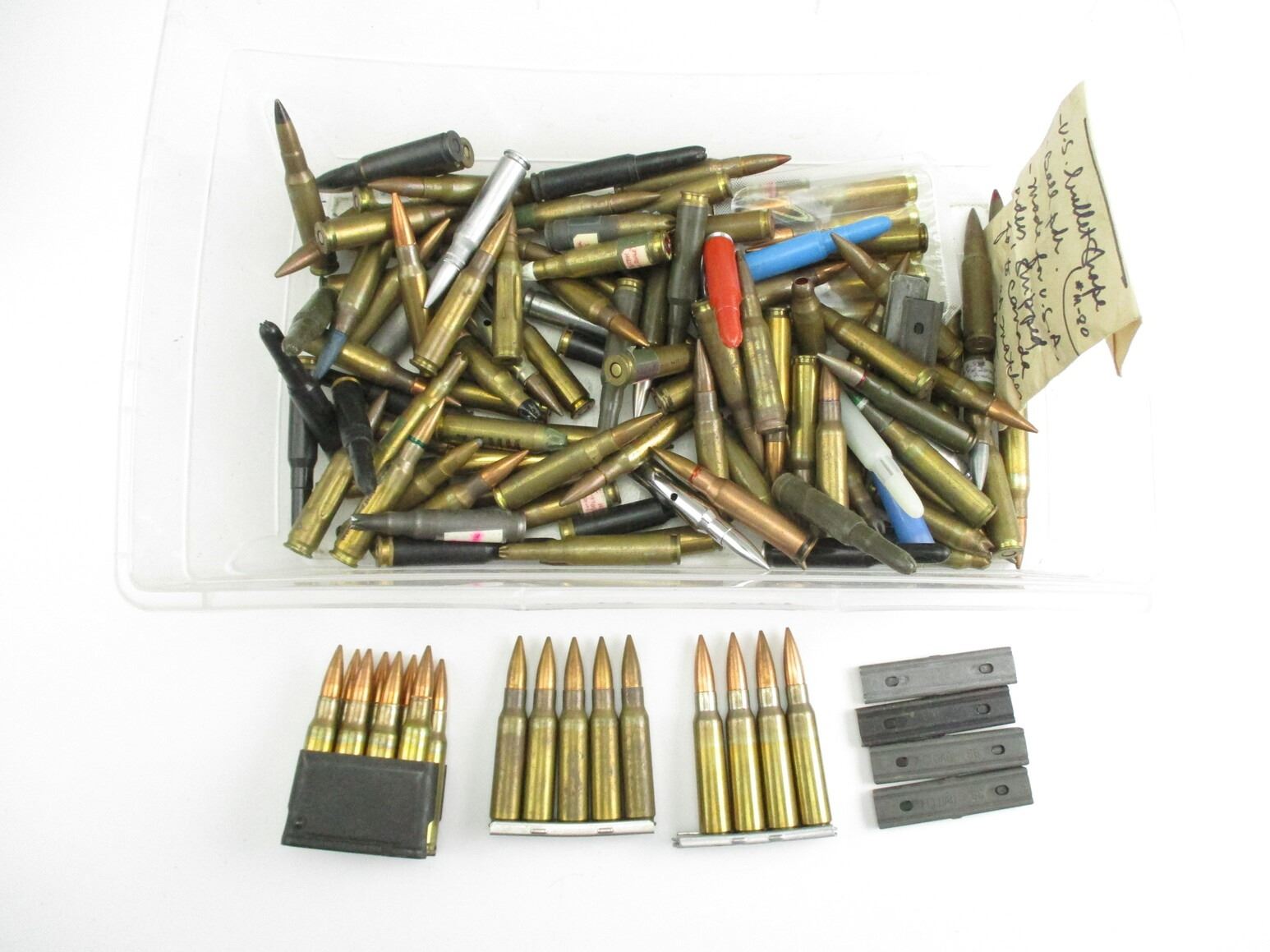 MILITARY ASSORTED 7.62 NATO AMMO, 125 RNDS, MAY INCLUDE OTHER CALIBERS, LOT INCLUDES TRACERS, ARMOR PIERCING, STRIPPER CLIPS, ENBLOCS, DUMMY RNDS, ETC., LOT MAY INCLUDE SOME FACTORY AMMO RNDS, THERE ARE NEW SHIPPING RESTRICTIONS, PLEASE MAKE SURE YOU HAVE READ AND CONFIRMED WE CAN SHIP TO YOU BEFORE BIDDING ON THIS LOT. PLEASE SEE LOT 0 IN THIS SESSION. NO REFUNDS WILL BE ISSUED, OR BIDS RETRACTED