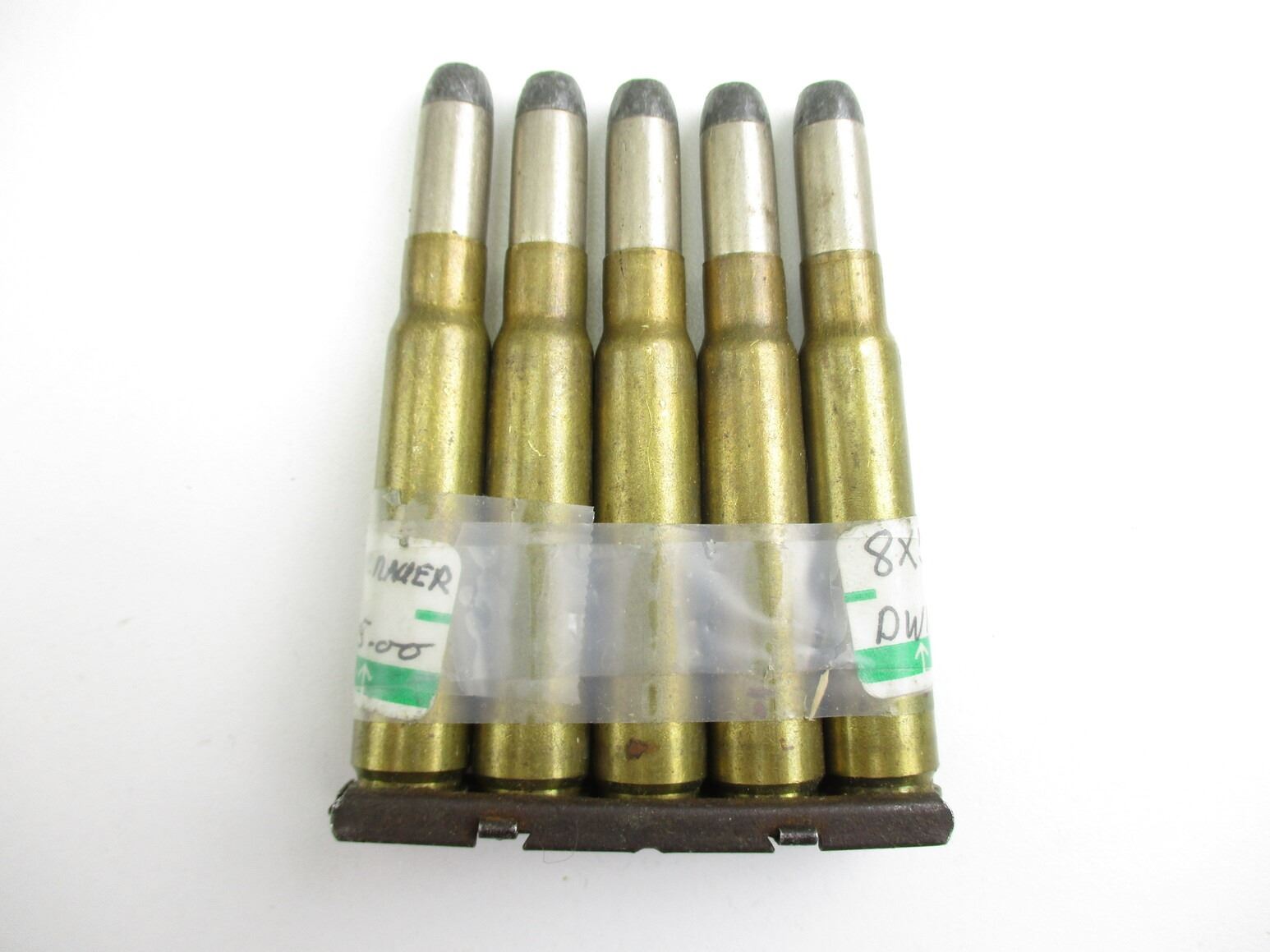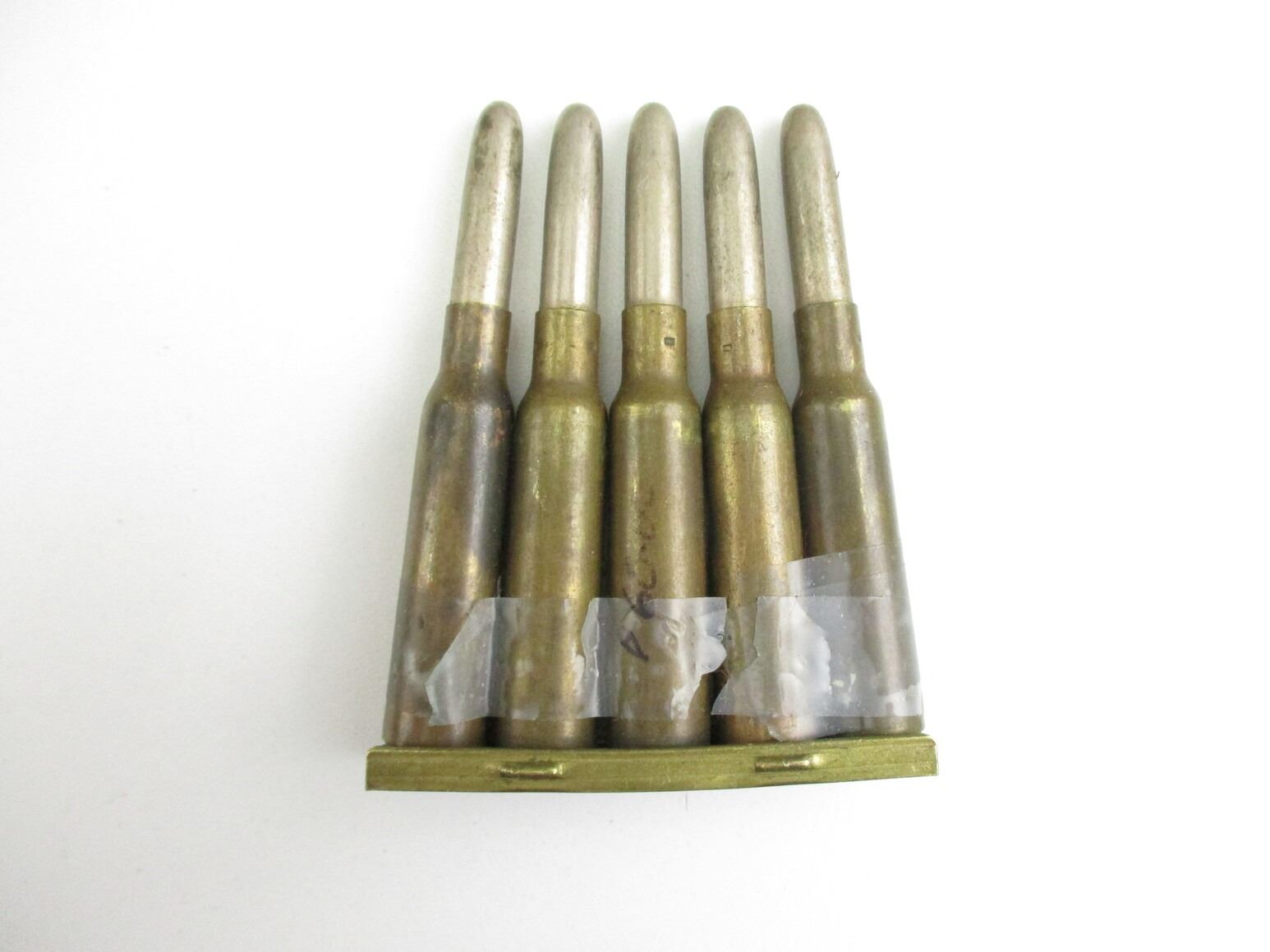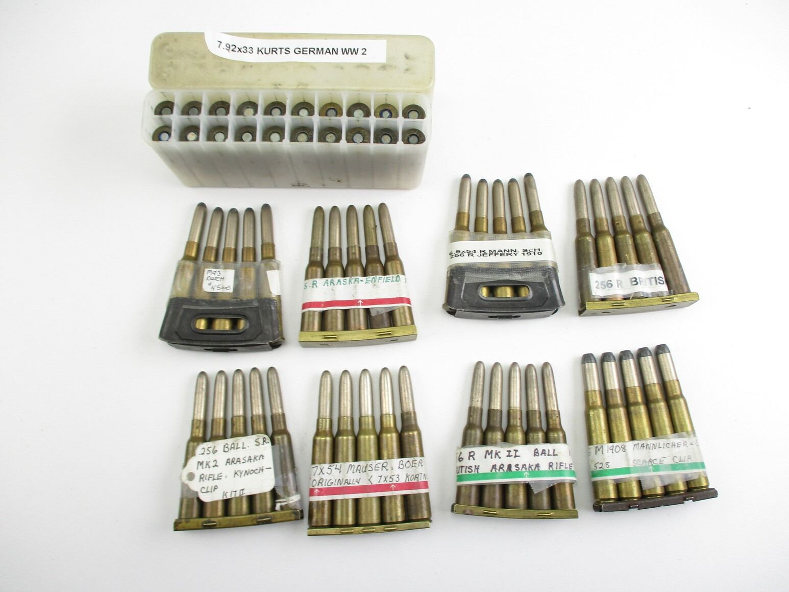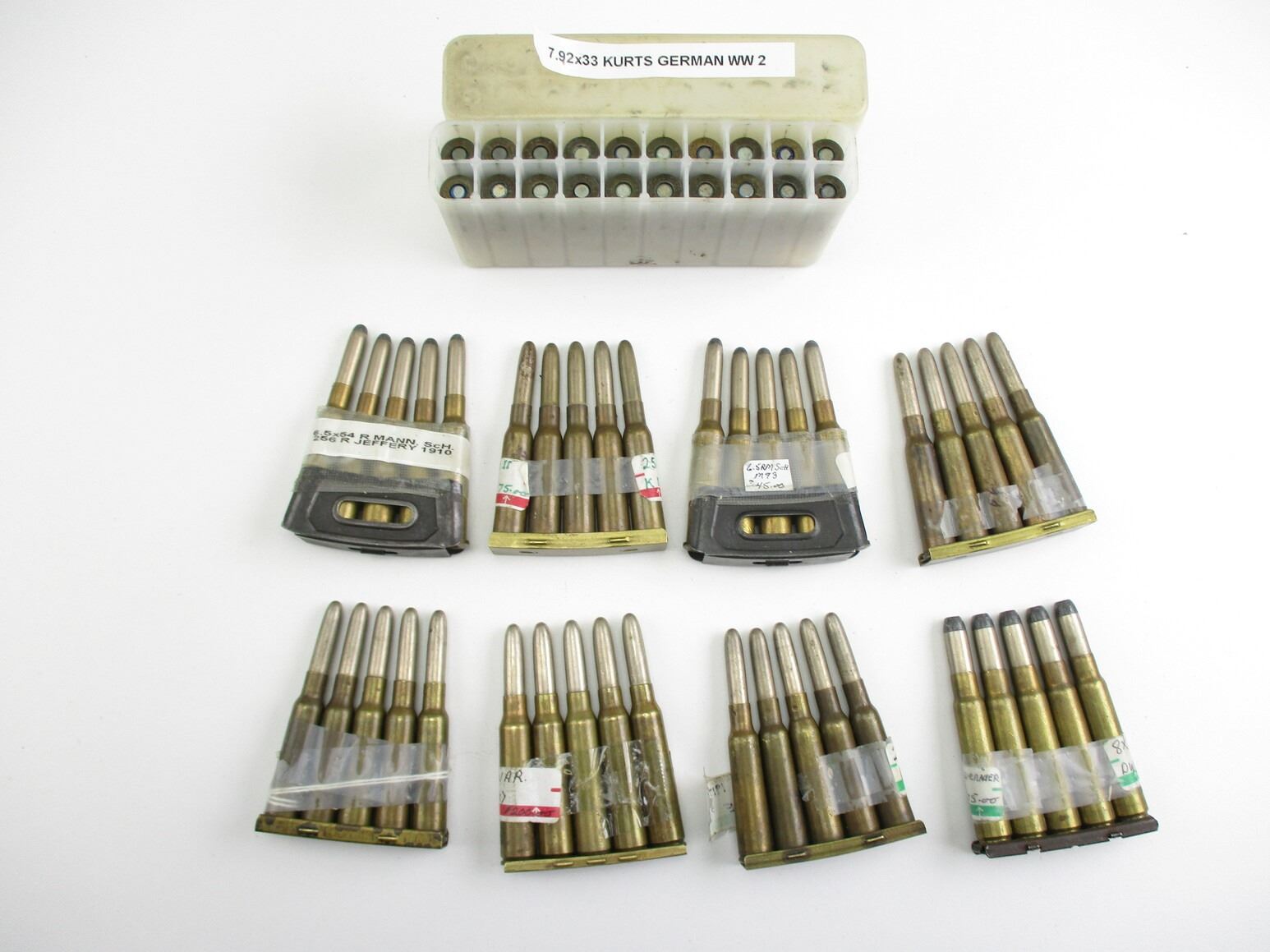 MILITARY ASSORTED AMMO LOT, 60 RNDS, VARIOUS CALIBERS INCLUDING: .256R BRITISH, 7.92X33 KURTZ, 6.5R MANN SCHOEN, 7X54 MAUSER, ETC., LOT INCLUDES (8) STRIPPER CLIPS, & (1) 20 ROUND AMMO CONTAINER, THERE ARE NEW SHIPPING RESTRICTIONS, PLEASE MAKE SURE YOU HAVE READ AND CONFIRMED WE CAN SHIP TO YOU BEFORE BIDDING ON THIS LOT. PLEASE SEE LOT 0 IN THIS SESSION. NO REFUNDS WILL BE ISSUED, OR BIDS RETRACTED