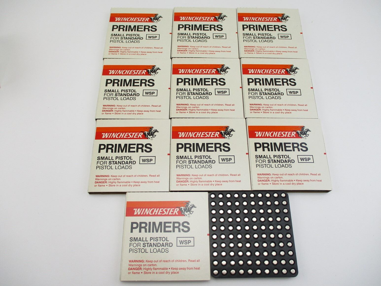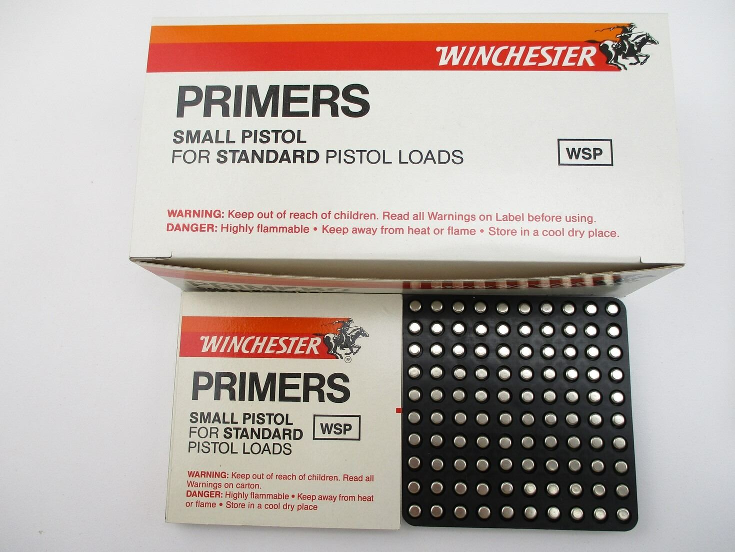 WINCHESTER SM PISTOL PRIMERS, APPROX 1000 PRIMERS, THERE ARE NEW SHIPPING RESTRICTIONS, PLEASE MAKE SURE YOU HAVE READ AND CONFIRMED WE CAN SHIP TO YOU BEFORE BIDDING ON THIS LOT. PLEASE SEE LOT 0 IN THIS SESSION. NO REFUNDS WILL BE ISSUED, OR BIDS RETRACTED