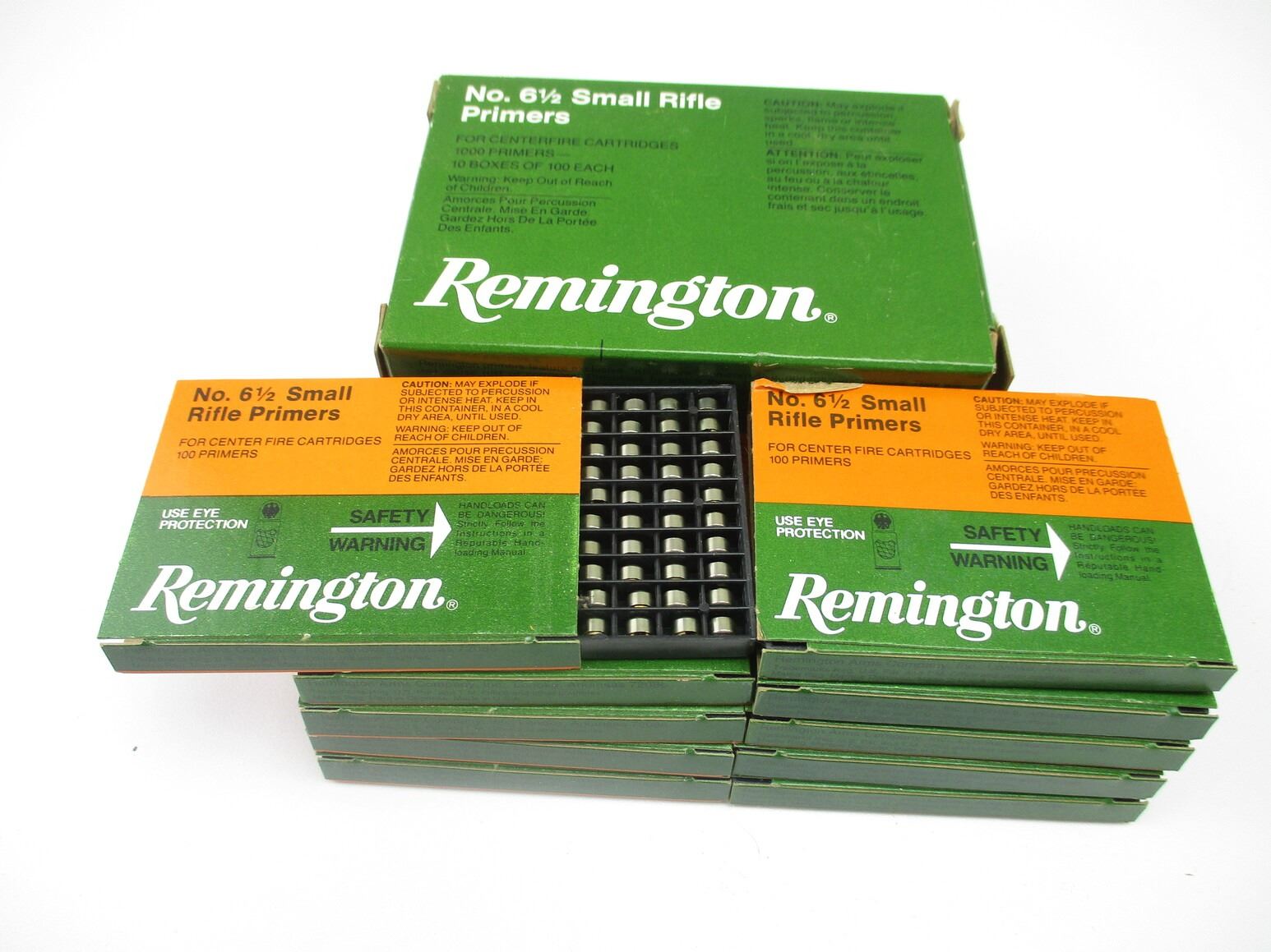 REMINGTON NO.6 1/2 SMALL RIFLE PRIMERS LOT, 1000 PRIMERS , THERE ARE NEW SHIPPING RESTRICTIONS, PLEASE MAKE SURE YOU HAVE READ AND CONFIRMED WE CAN SHIP TO YOU BEFORE BIDDING ON THIS LOT. PLEASE SEE LOT 0 IN THIS SESSION. NO REFUNDS WILL BE ISSUED, OR BIDS RETRACTED