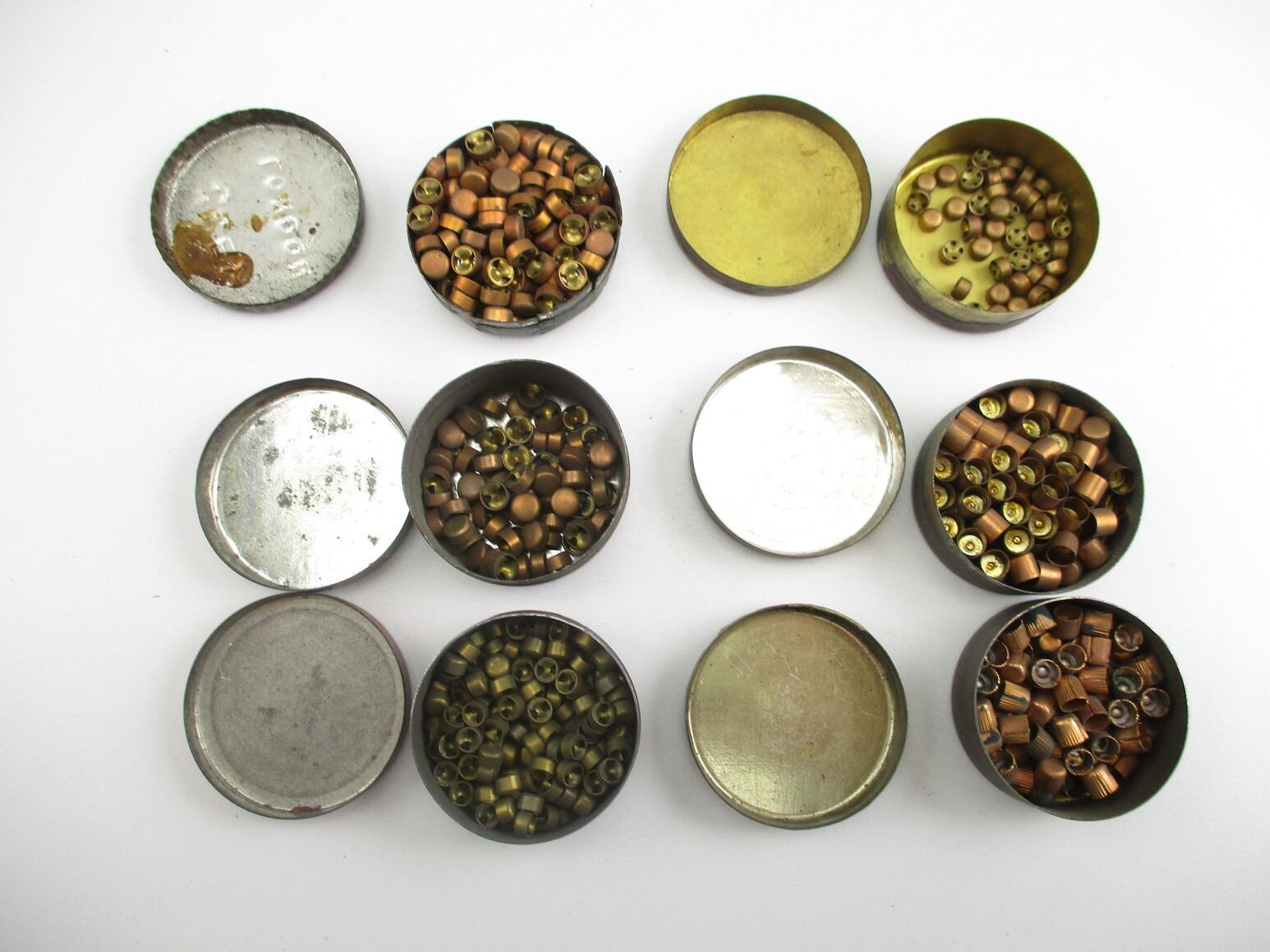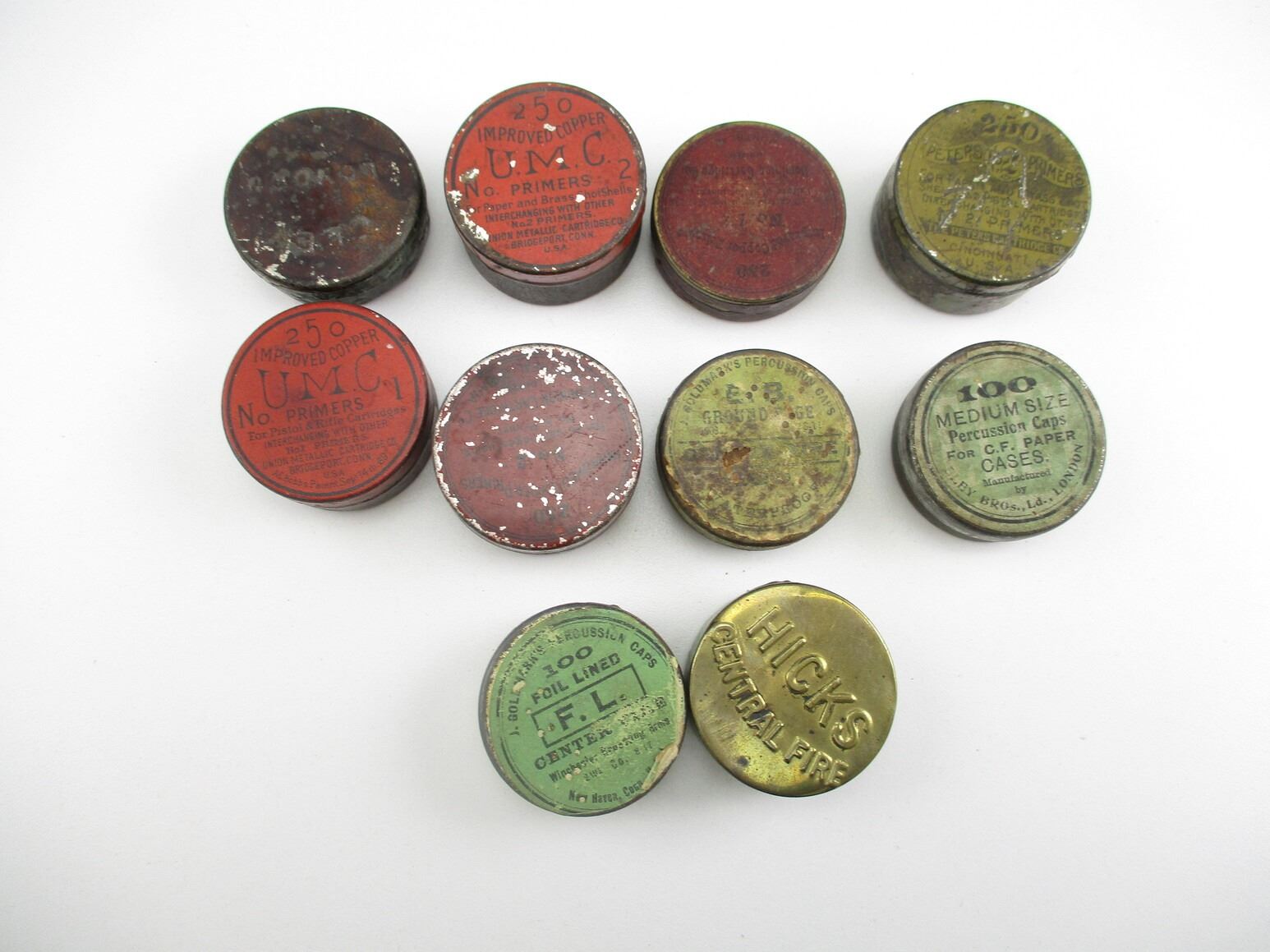 ASSORTED PRIMERS AND PERCUSSION CAPS LOT, APPROX 200, VARIOUS MFG'S INCLUDING: UMC, HICKS, ELEY, ETC., ALL IN COLLECTIBLE TINS, THERE ARE NEW SHIPPING RESTRICTIONS, PLEASE MAKE SURE YOU HAVE READ AND CONFIRMED WE CAN SHIP TO YOU BEFORE BIDDING ON THIS LOT. PLEASE SEE LOT 0 IN THIS SESSION. NO REFUNDS WILL BE ISSUED, OR BIDS RETRACTED