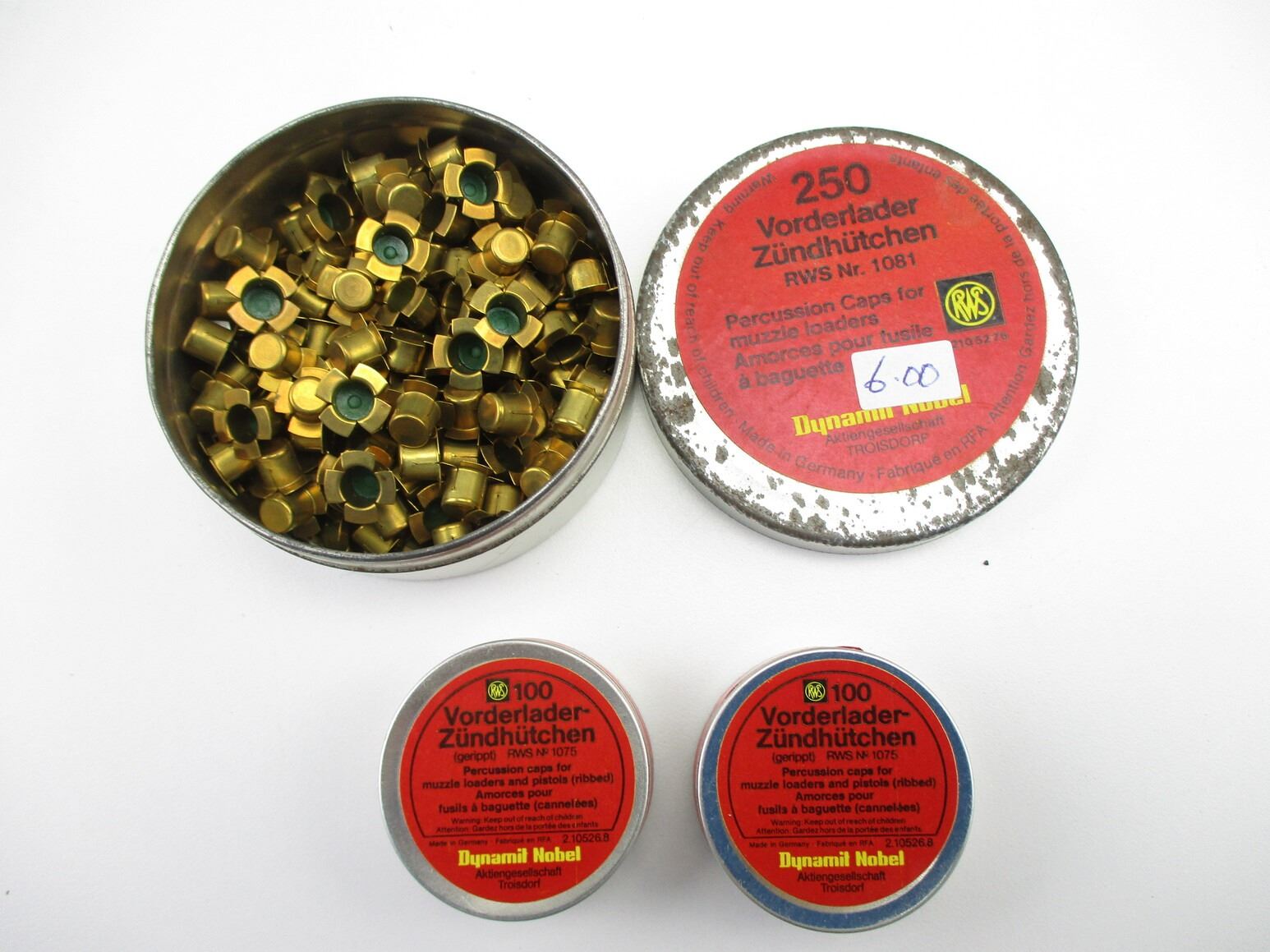 RWS ASSORTED PERCUSSION CAPS LOT, APPROX 400 PERCUSSION CAPS, LOT INCLUDES NO.1081, & NO.1075, THERE ARE NEW SHIPPING RESTRICTIONS, PLEASE MAKE SURE YOU HAVE READ AND CONFIRMED WE CAN SHIP TO YOU BEFORE BIDDING ON THIS LOT. PLEASE SEE LOT 0 IN THIS SESSION. NO REFUNDS WILL BE ISSUED, OR BIDS RETRACTED