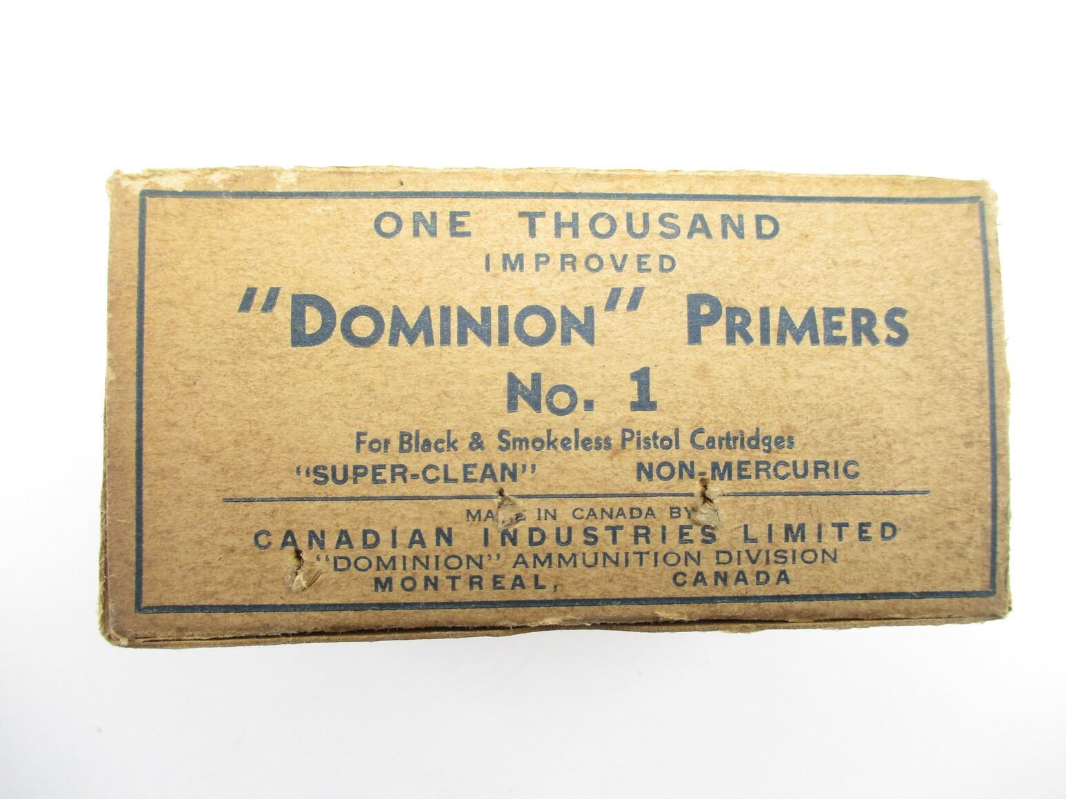 DOMINION NO.1 PISTOL PRIMERS LOT, APPROX 1000 PRIMERS, THERE ARE NEW SHIPPING RESTRICTIONS, PLEASE MAKE SURE YOU HAVE READ AND CONFIRMED WE CAN SHIP TO YOU BEFORE BIDDING ON THIS LOT. PLEASE SEE LOT 0 IN THIS SESSION. NO REFUNDS WILL BE ISSUED, OR BIDS RETRACTED