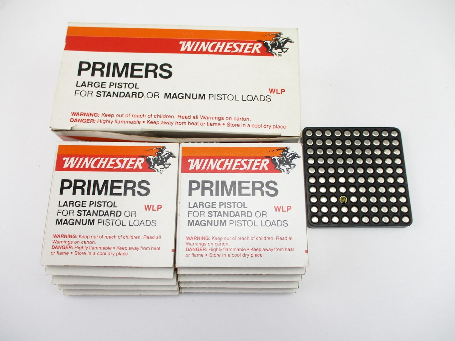 WINCHESTER NO.WLP LARGE PISTOL PRIMERS, APPROX 1000 PRIMERS, THERE ARE NEW SHIPPING RESTRICTIONS, PLEASE MAKE SURE YOU HAVE READ AND CONFIRMED WE CAN SHIP TO YOU BEFORE BIDDING ON THIS LOT. PLEASE SEE LOT 0 IN THIS SESSION. NO REFUNDS WILL BE ISSUED, OR BIDS RETRACTED