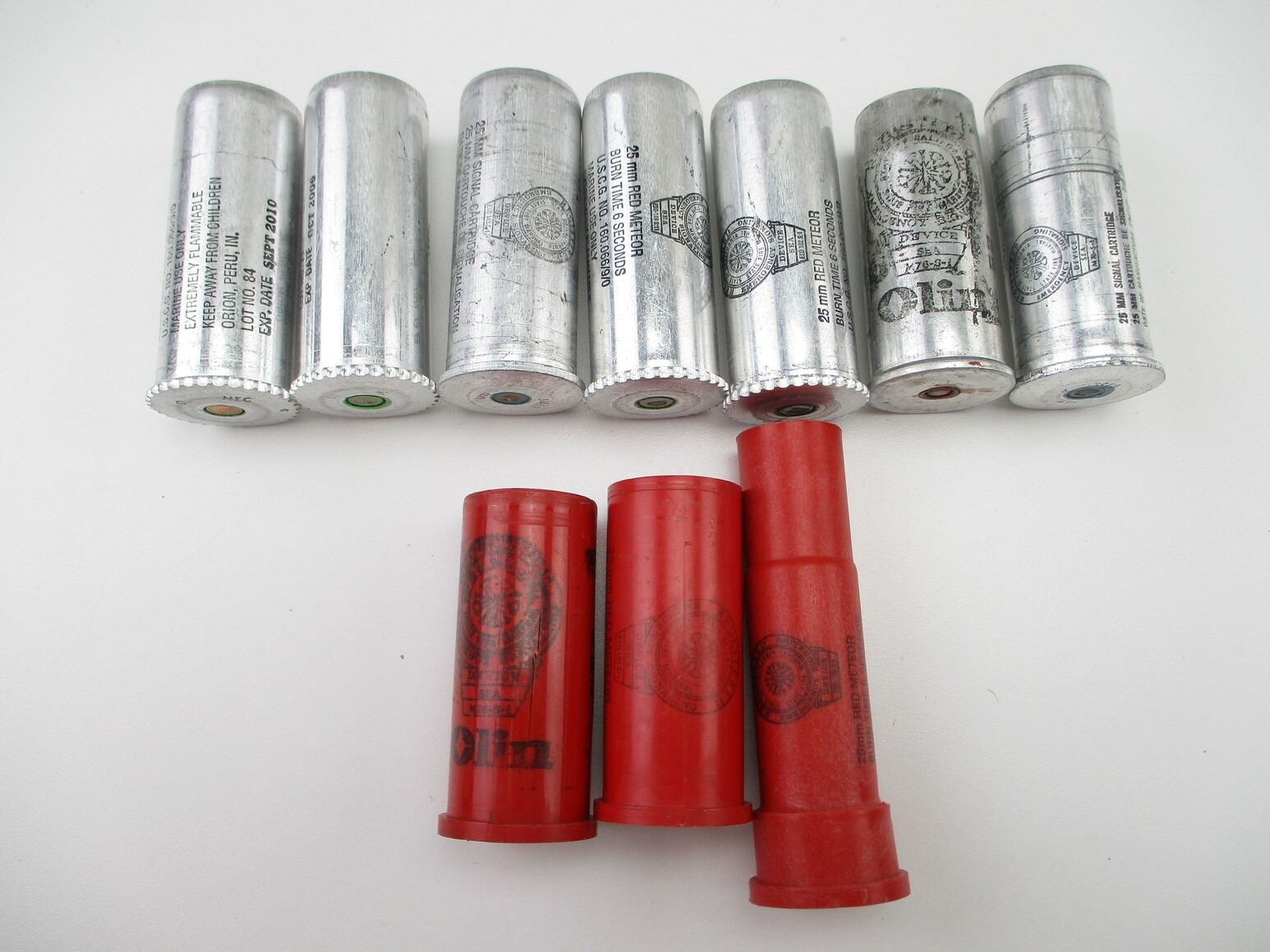 MILITARY ASSORTED 25MM SIGNAL FLARES LOT, 9 RNDS, SEE PHOTOS, THERE ARE NEW SHIPPING RESTRICTIONS, PLEASE MAKE SURE YOU HAVE READ AND CONFIRMED WE CAN SHIP TO YOU BEFORE BIDDING ON THIS LOT. PLEASE SEE LOT 0 IN THIS SESSION. NO REFUNDS WILL BE ISSUED, OR BIDS RETRACTED