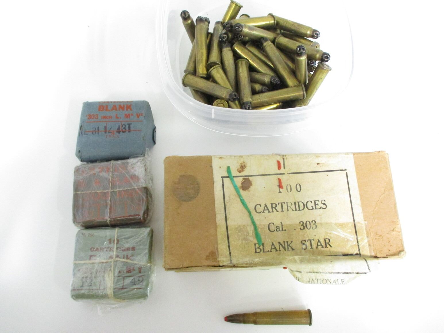 MILITARY ASSORTED .303 BRITISH BLANKS LOT, 177 RNDS, VARIOUS MFG'S, LOT MAY INCLUDE OTHER CALIBERS, THERE ARE NEW SHIPPING RESTRICTIONS, PLEASE MAKE SURE YOU HAVE READ AND CONFIRMED WE CAN SHIP TO YOU BEFORE BIDDING ON THIS LOT. PLEASE SEE LOT 0 IN THIS SESSION. NO REFUNDS WILL BE ISSUED, OR BIDS RETRACTED